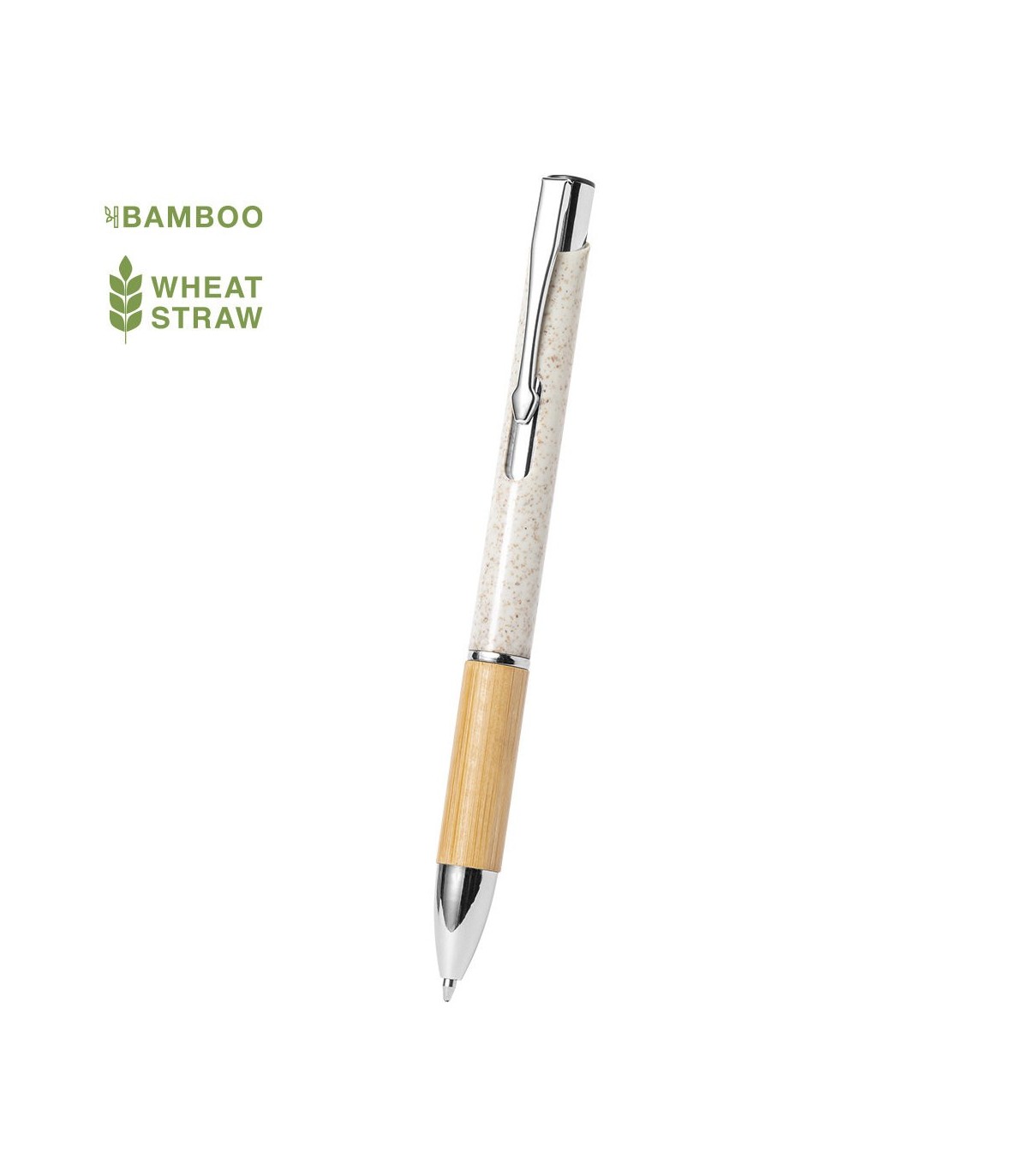 Bolígrafo de fabricación ecológica con cuerpo en combinación de caña de trigo y bambú, para así fomentar la utilización de materias primas naturales y reducir las emisiones contaminantes. Clip metálico y accesorios en cromado. De mecanismo pulsador, con cartucho jumbo y tinta azul. Disponible en variada gama de colores nature. Con distintivo Wheat Straw en la parte superior del bolígrafo.