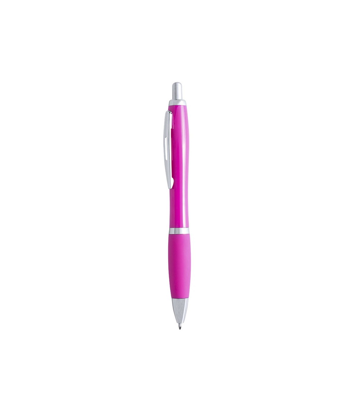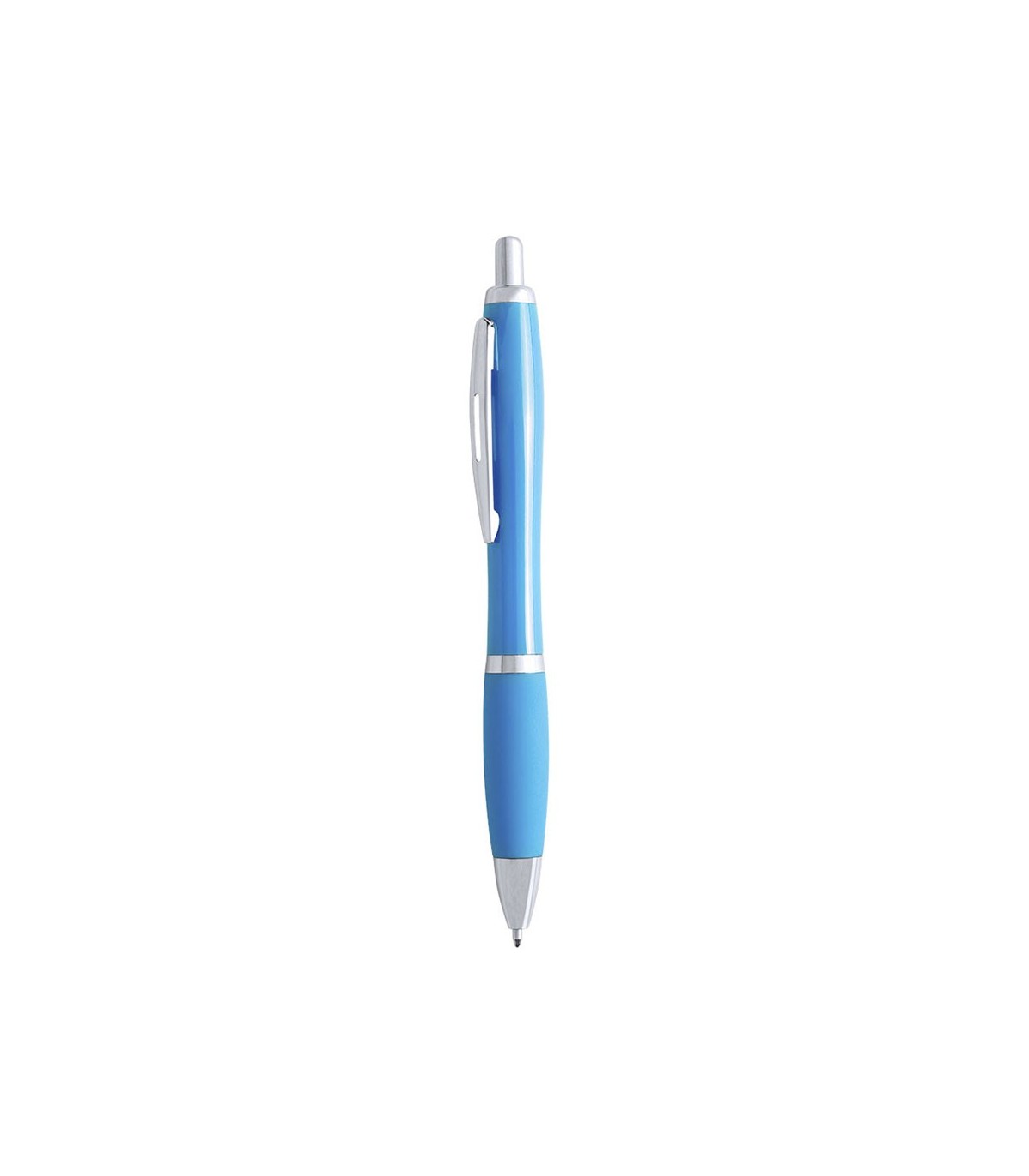 Bolígrafo de apertura con mecanismo pulsador y atrevido diseño bicolor con accesorios en color plateado y cuerpo de suave acabado en divertidos colores sólidos. Con original clip metálico troquelado a juego y cómoda empuñadura. Escritura en tinta de color azul.