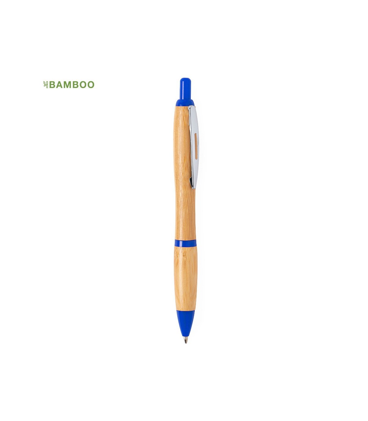 Bolígrafo con mecanismo pulsador y fabricación ecológica, con cuerpo en bambú y detalles en diversa gama de colores. Con original clip metálico troquelado y cómoda empuñadura de bambú. Escritura en tinta de color azul.