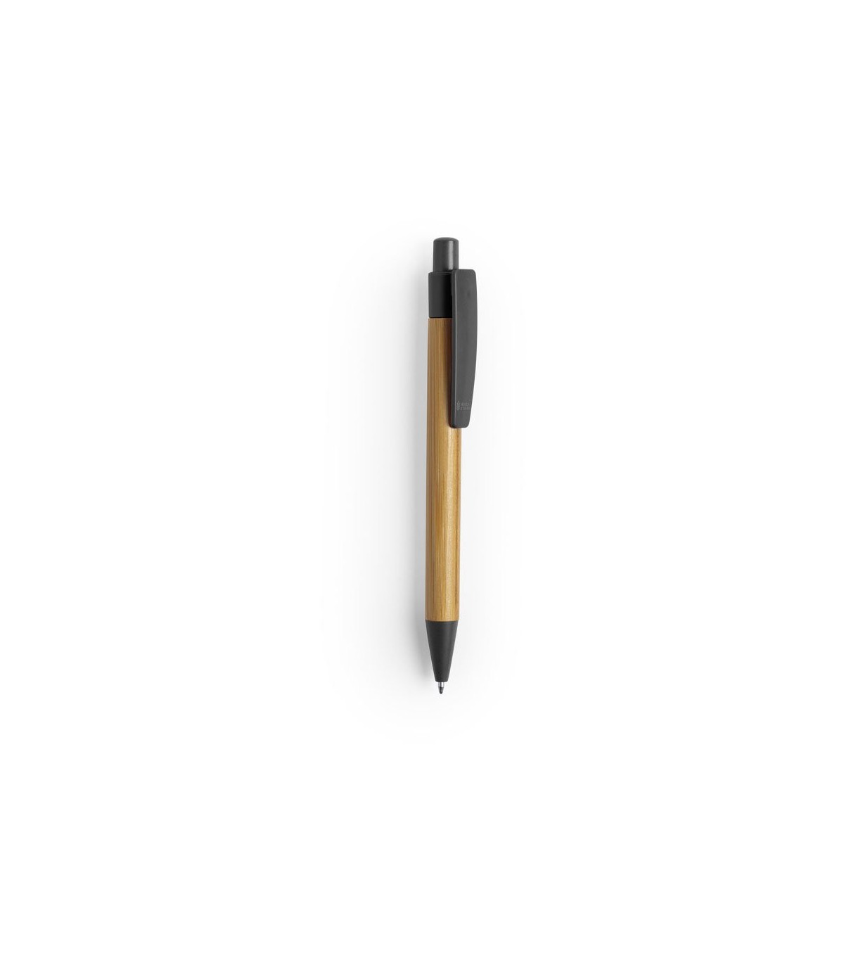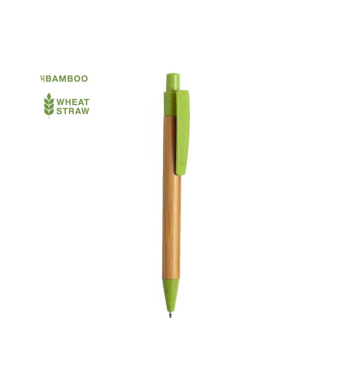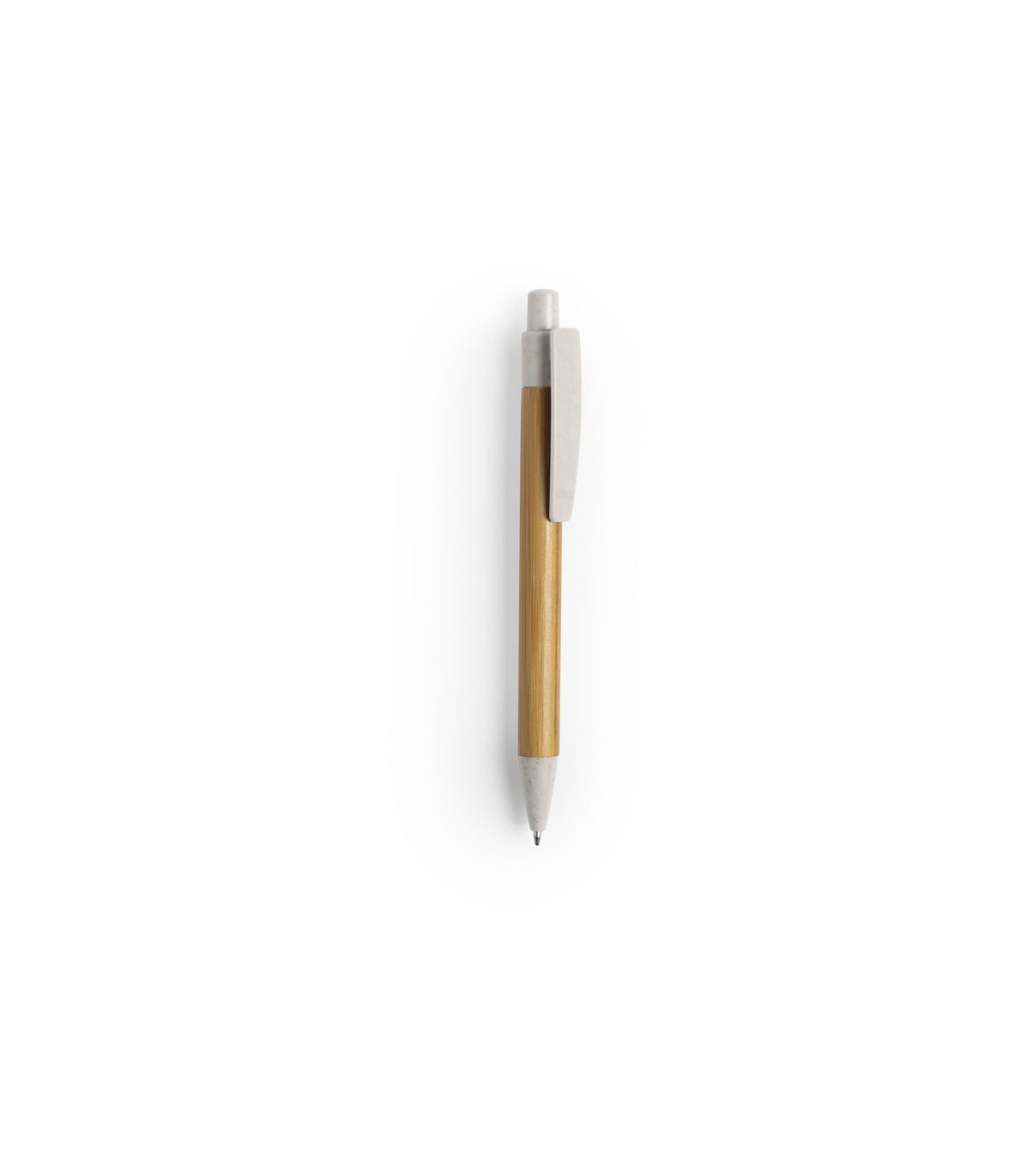 Bolígrafo con mecanismo pulsador y fabricación ecológica. Cuerpo en bambú, con accesorios a juego en caña de trigo, para así fomentar la utilización de materias primas naturales y reducir las emisiones contaminantes. Original clip tamaño XL y disponible en diversa gama de colores y en tinta azul.