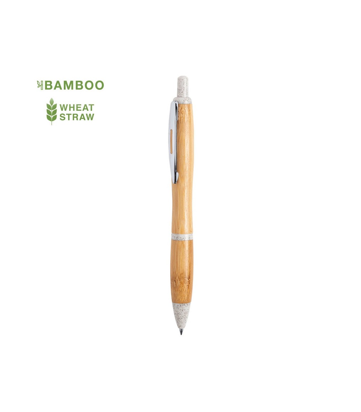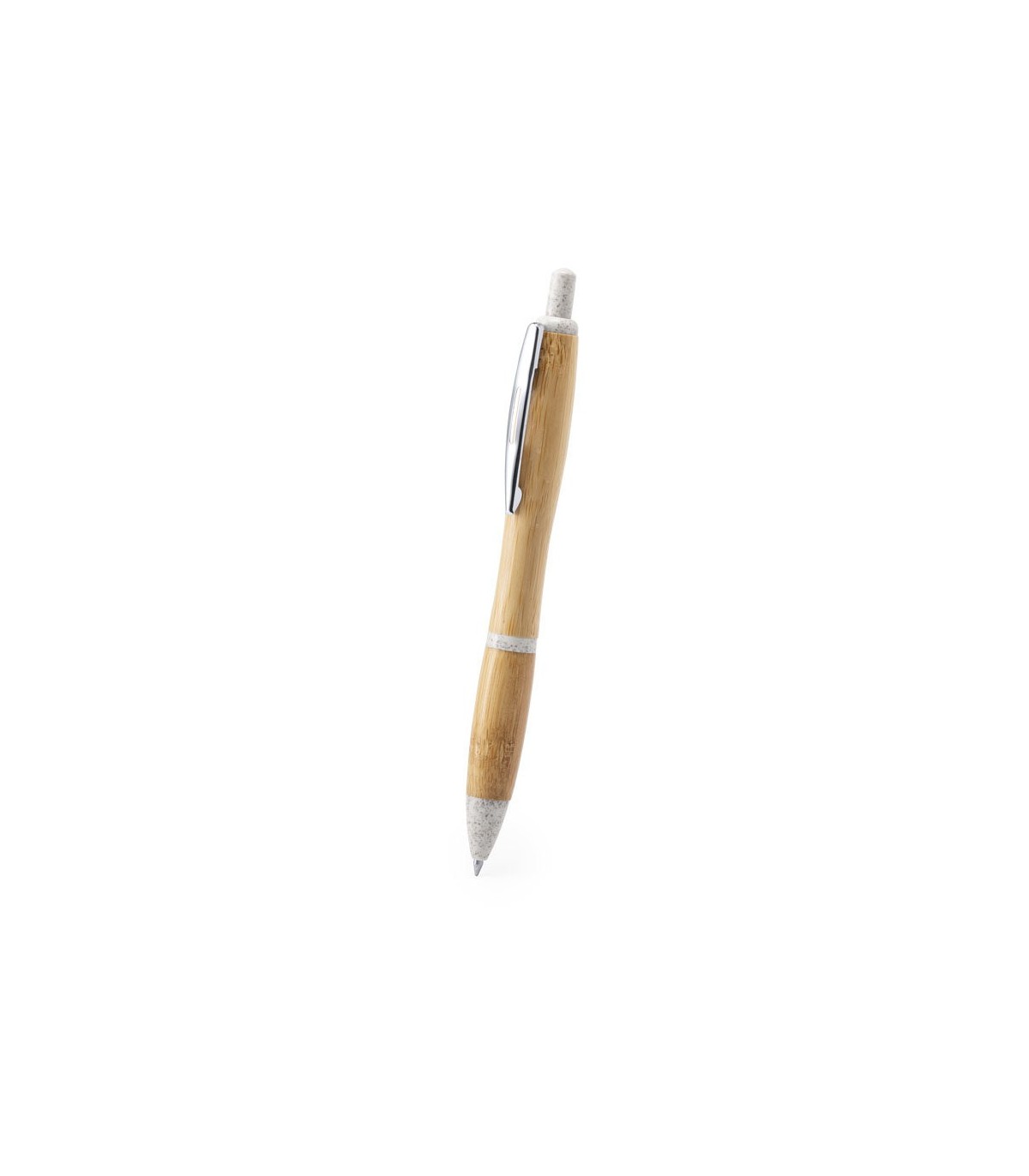 Bolígrafo con mecanismo pulsador y fabricación ecológica. Cuerpo en bambú, con pulsador y punta en caña de trigo, para así fomentar la utilización de materias primas naturales y reducir las emisiones contaminantes. Con original clip metálico troquelado y cómoda empuñadura de bambú. De cartucho jumbo y en tinta azul.