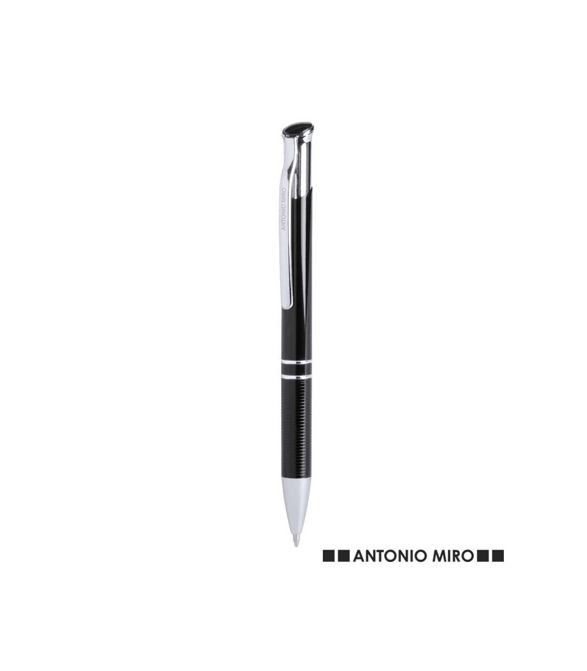 Bolígrafo de Antonio Miró de elegante diseño en color negro y suave cuerpo de aluminio con accesorios en color plateado. De mecanismo pulsador, con original clip metálico y presentado en estuche individual de aluminio negro con logotipo de la marca. Tinta azul.