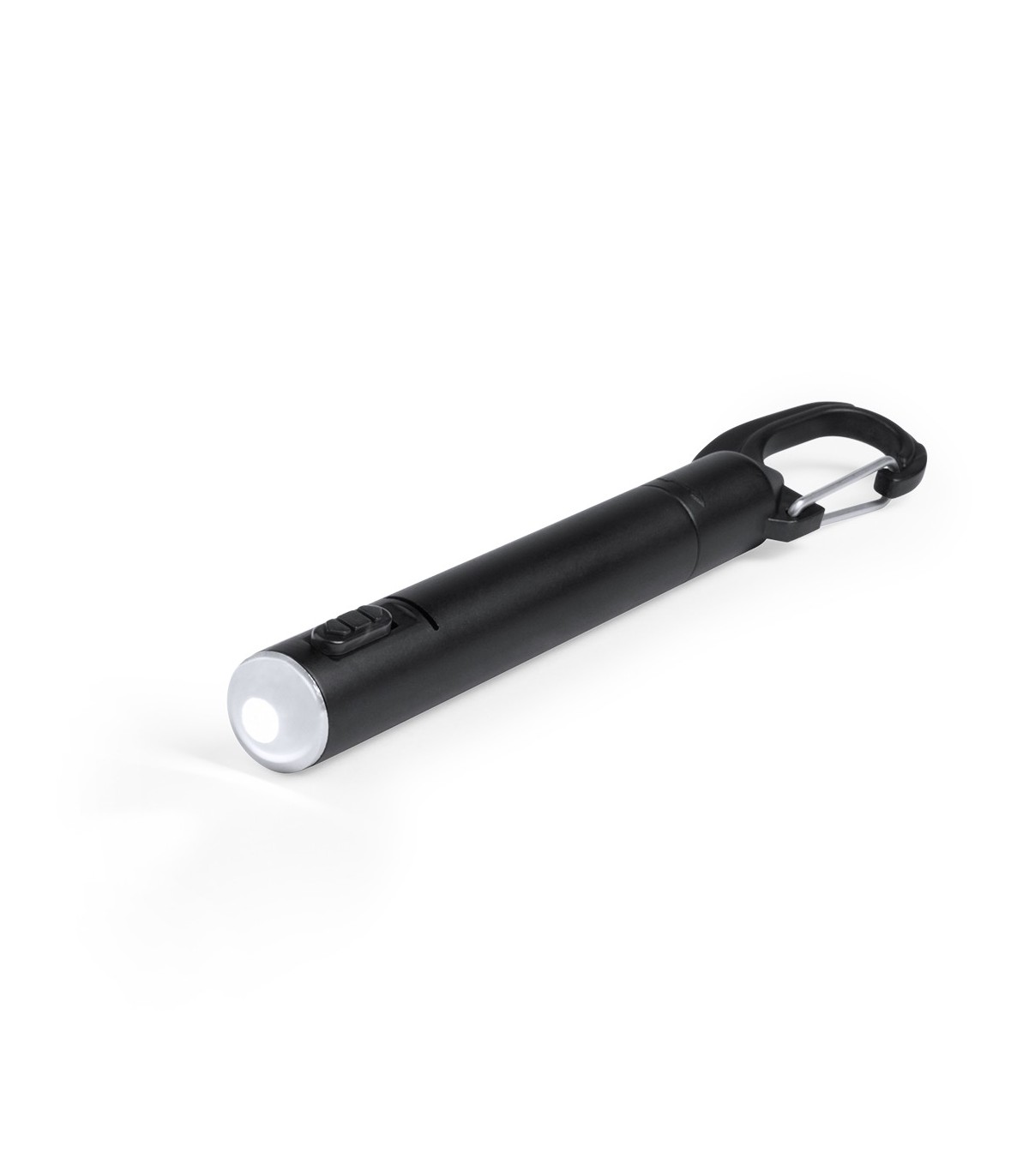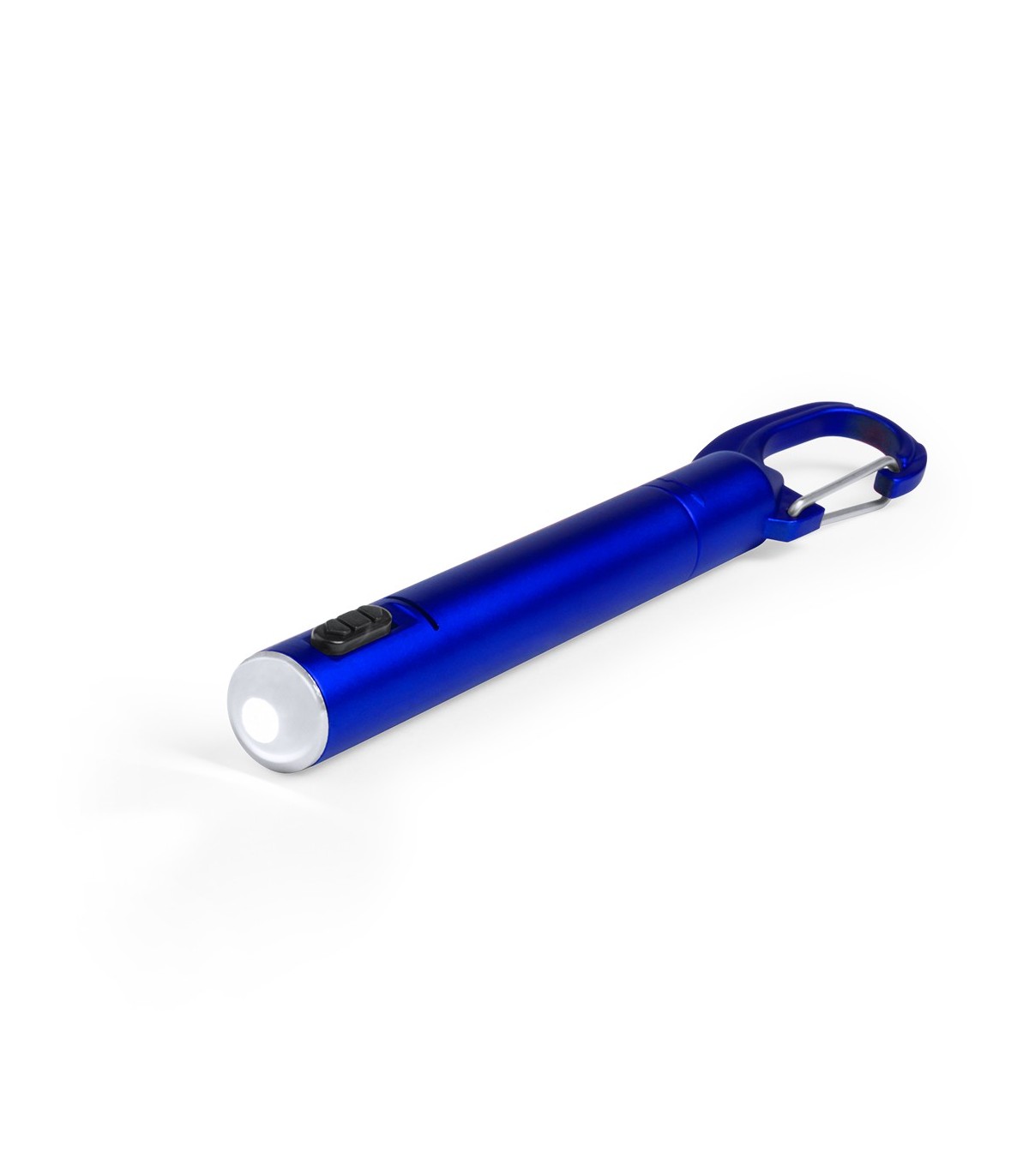Boligrafo con linterna led integrada. De original diseño, con cuerpo en suave acabado metalizado de variados colores y capucha con mosquetón. En tinta azul y con pilas de botón incluidas.