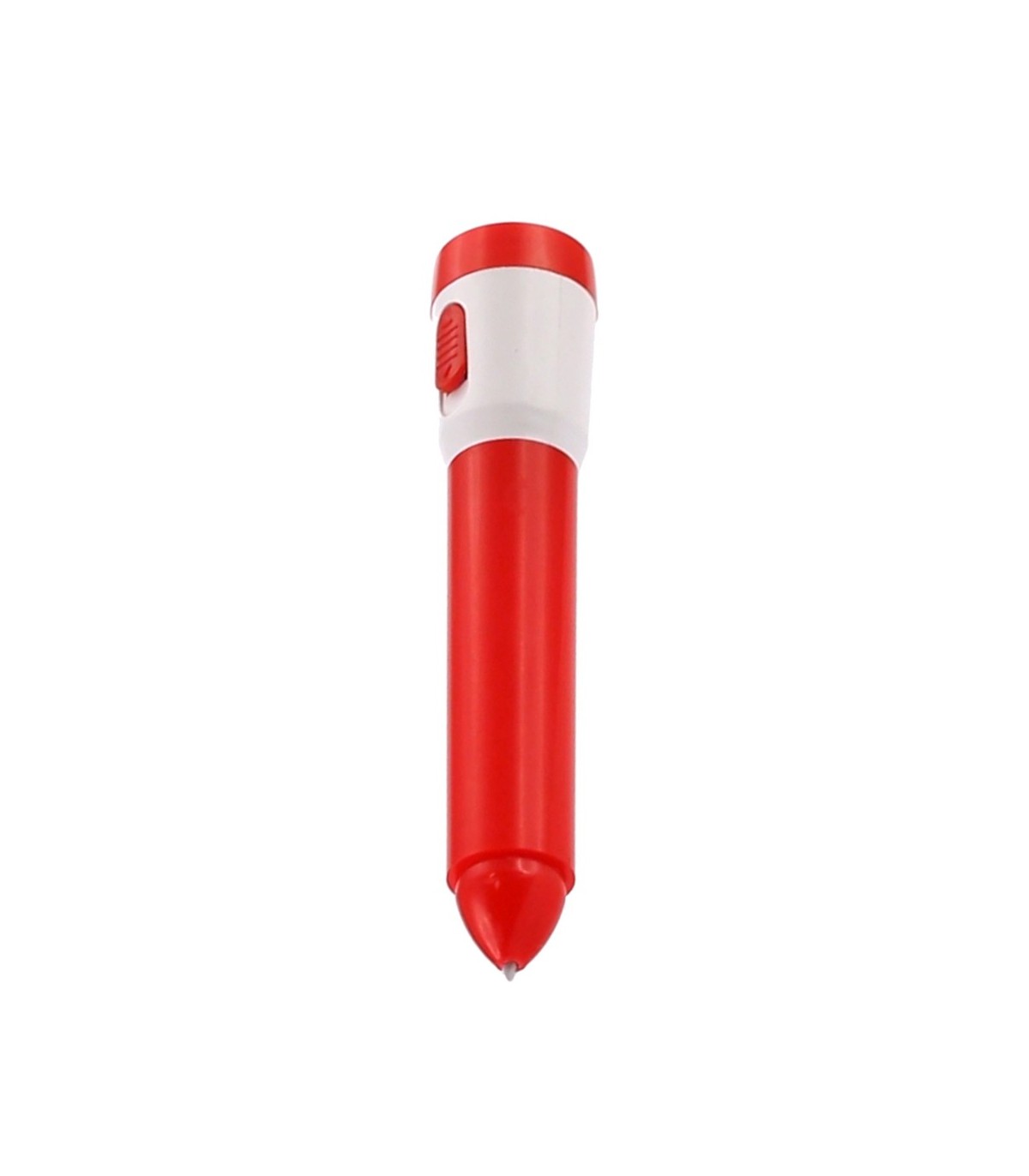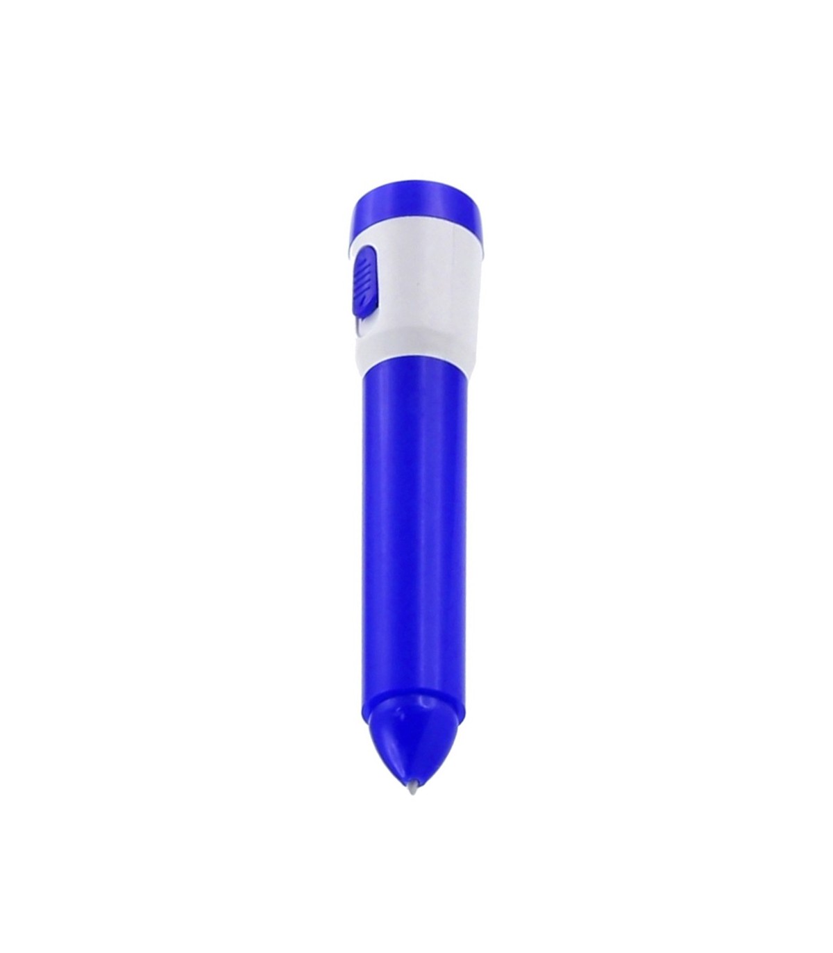 Bolígrafo de capucha con linterna led integrada en originales colores. En tinta azul y con pilas de botón incluidas.