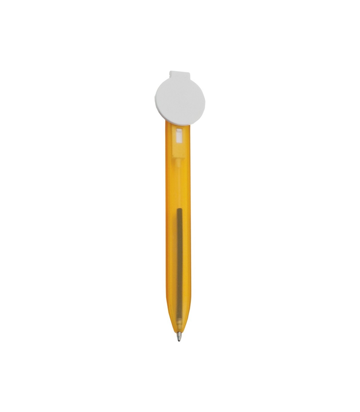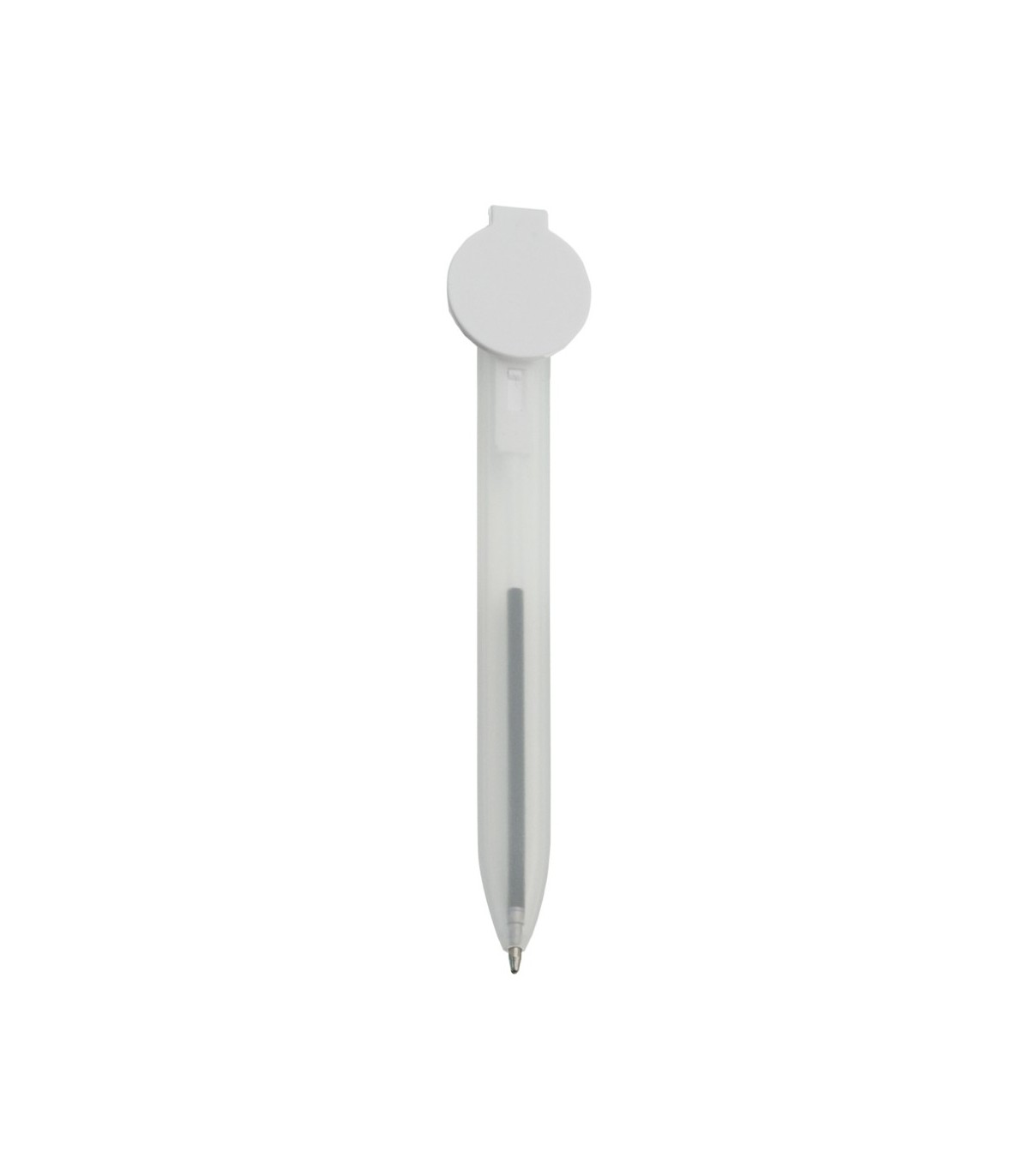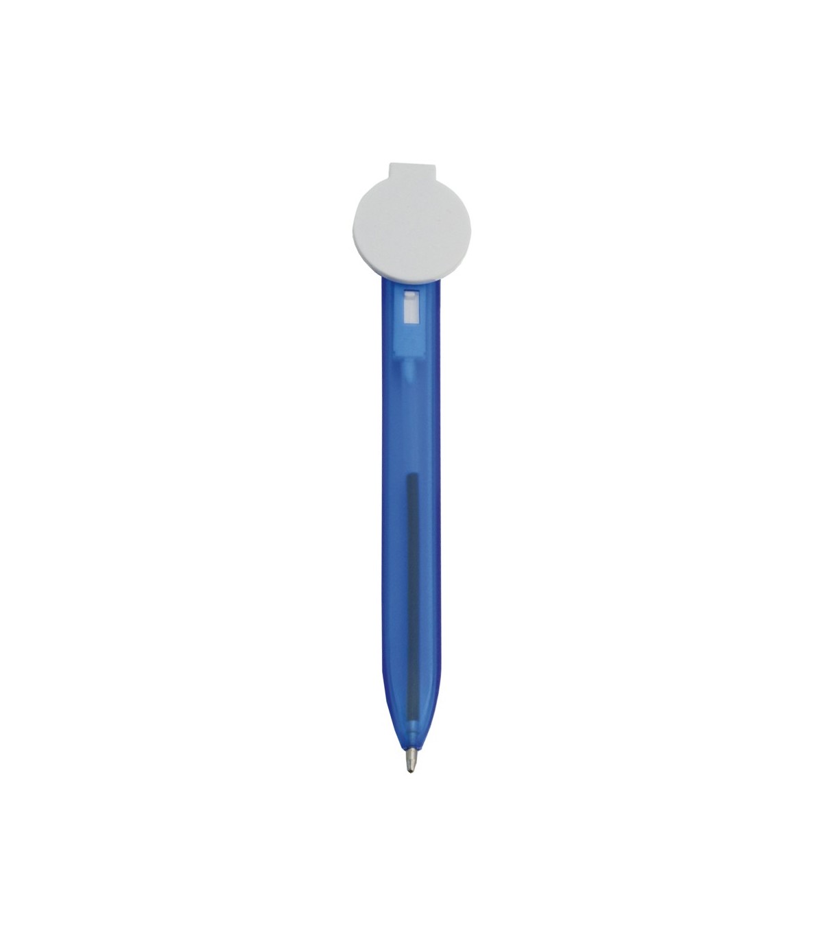 Bolígrafo marcapáginas en original diseño bicolor, con cuerpo translúcido y mecanismo de pulsador. Con zona de marcaje circular para impresión en tampografía.