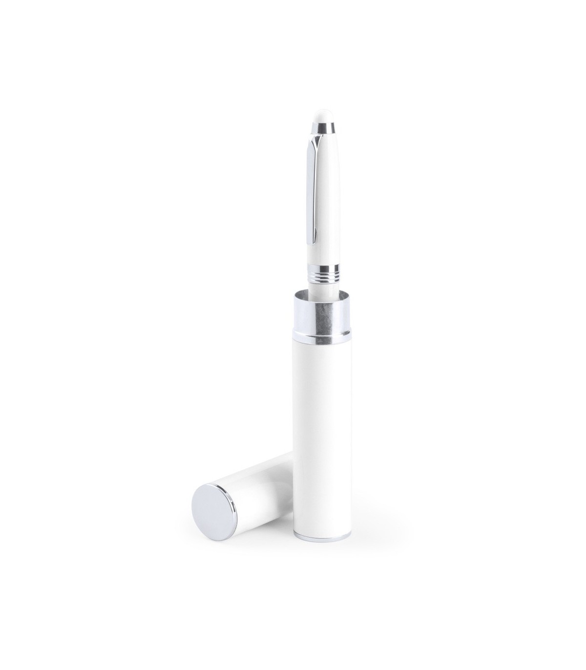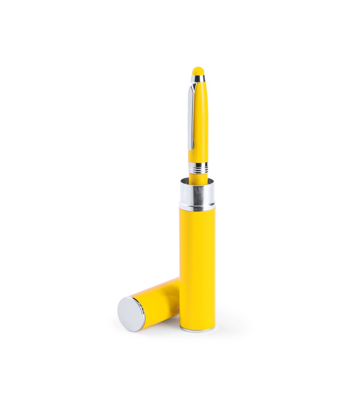 Bolígrafo puntero de apertura con sistema giratorio con cuerpo metálico de suave acabado en alegres colores. Accesorios y anillas en color plateado. Con puntero a juego y presentado en original estuche metálico a juego. De cartucho jumbo y con escritura en tinta azul.