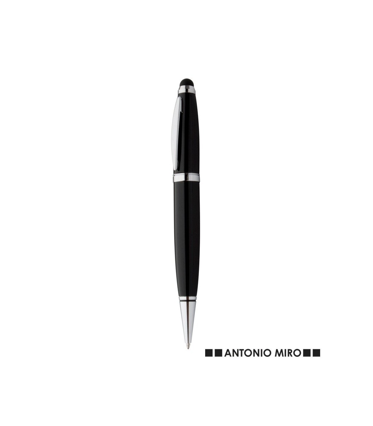Bolígrafo tecnológico multifunción de Antonio Miró, con memoria USB de 32GB de capacidad integrada en la capucha y puntero de suave goma a juego. Cuerpo en acabado métálico brillante con logotipo de la marca, de apertura giratoria y con tinta negra. Presentado en elegante caja de cartón de color negro de cierre magnético con logotipo de la marca y suave espuma troquelada.