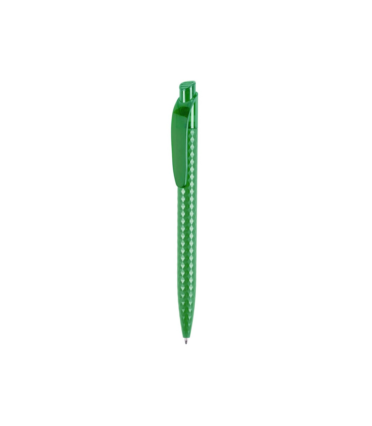 Bolígrafo de apertura con mecanismo pulsador con cuerpo en original diseño de rombos y tacto extra suave. En diversa gama de llamativos colores, con clip y pulsador de acabado transparente. Escritura en tinta de color azul.