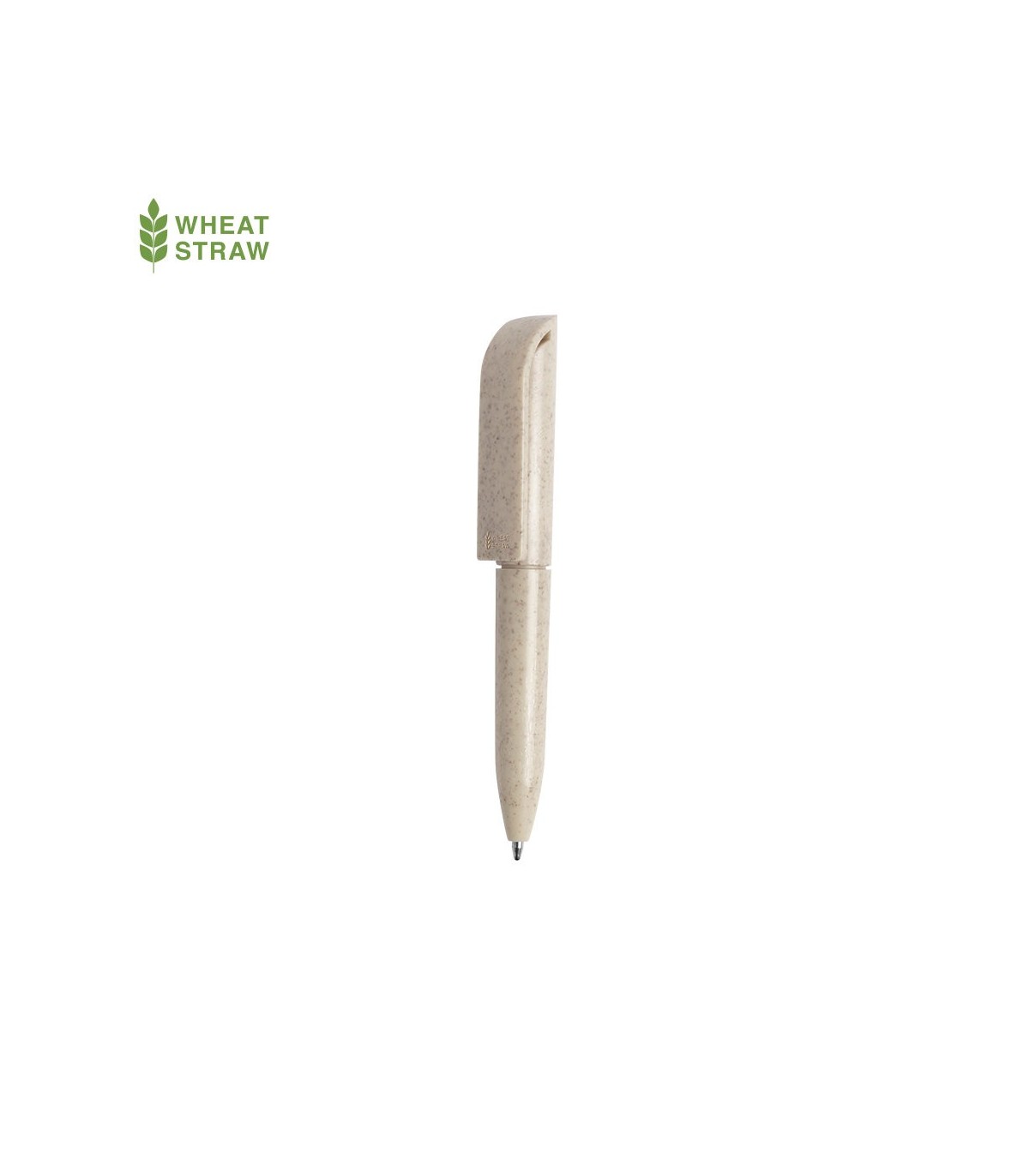 Minibolígrafo con mecanismo giratorio de fabricación ecológica. Cuerpo y accesorios en caña de trigo, para así fomentar la utilización de materias primas naturales y reducir las emisiones contaminantes. Disponible en diversa gama de colores y en tinta azul.