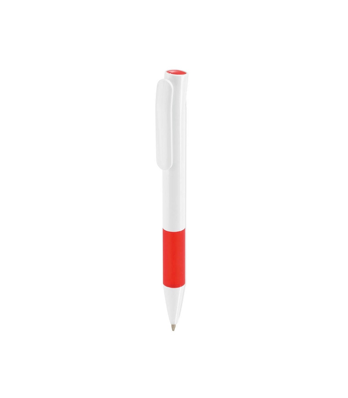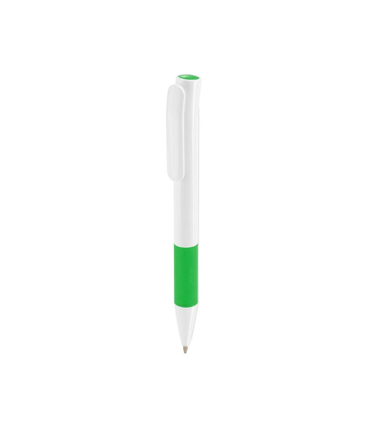 Bolígrafos publicitarios recargables personalizado blancos con detalles de colores en el cuerpo y cabezal, ideal para regalos originales. Bolígrafo Kimon.