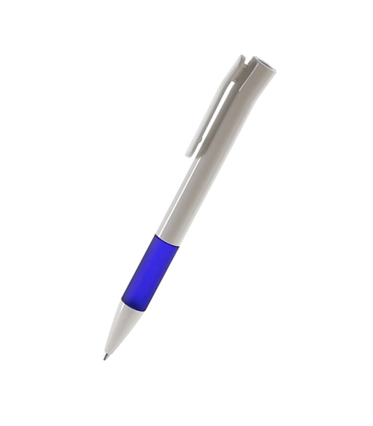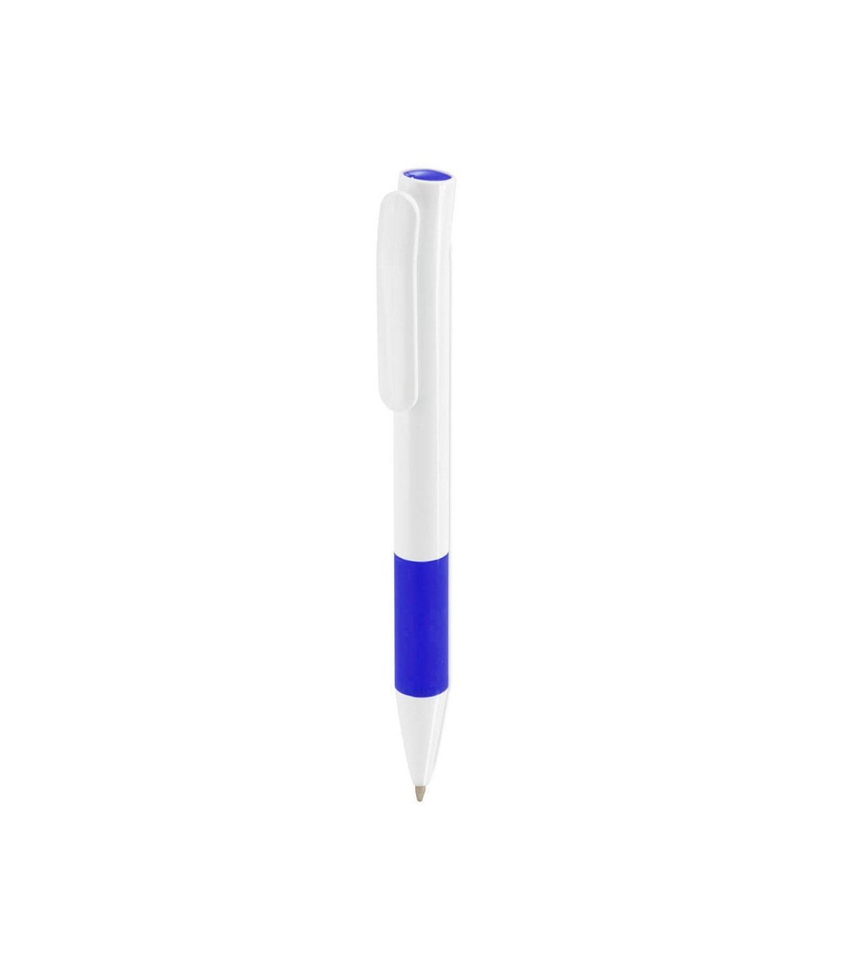 Bolígrafo de apertura con sistema giratorio de atrevido diseño bicolor con accesorios en llamativos colores translúcidos y cuerpo de suave acabado en color blanco sólido. Con original clip curvado. Escritura en tinta de color azul.