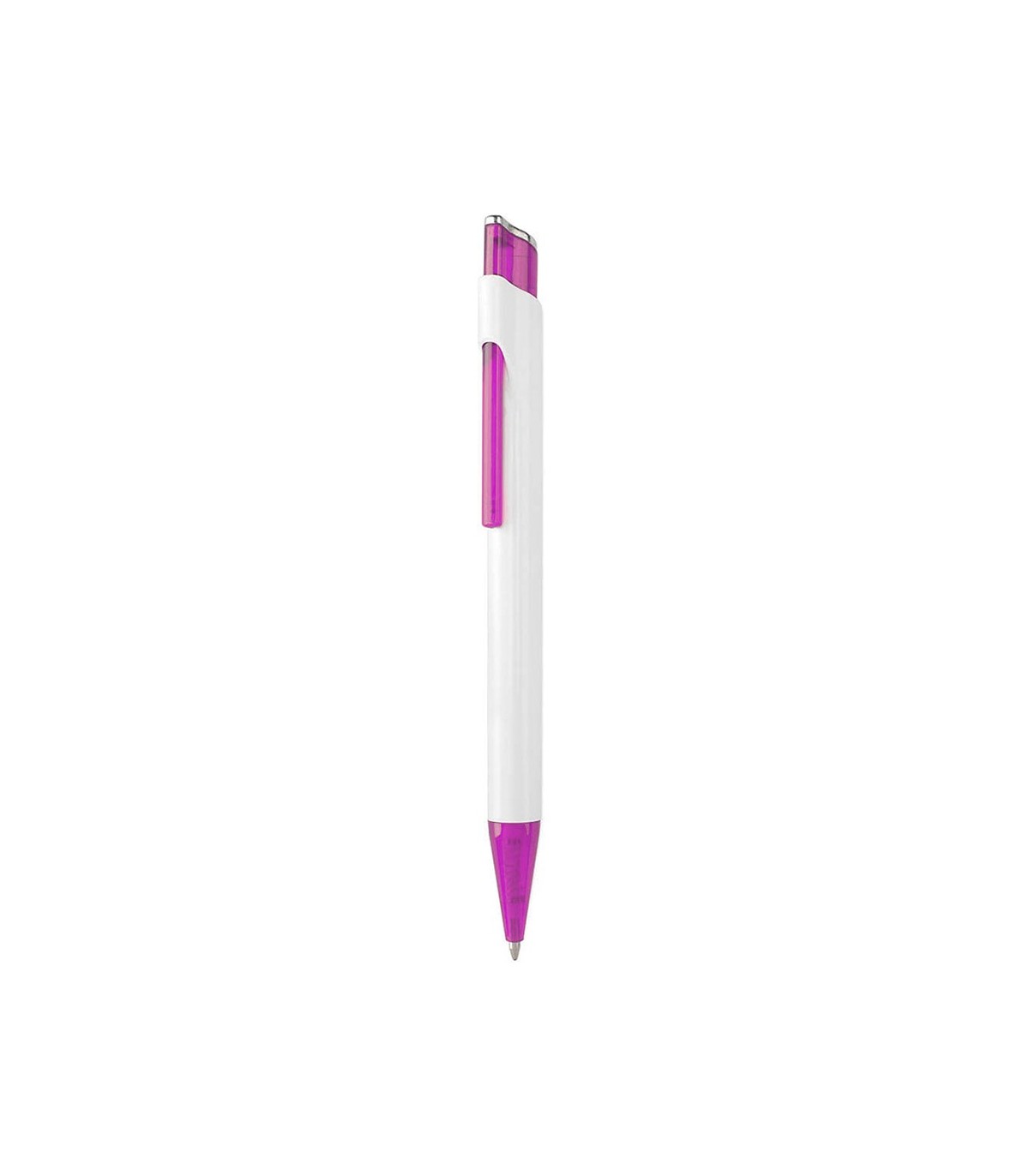 Bolígrafo de apertura con mecanismo pulsador y atrevido diseño bicolor con accesorios en llamativos colores translúcidos y cuerpo de suave acabado en color blanco. Con clip a juego y con escritura en tinta azul.