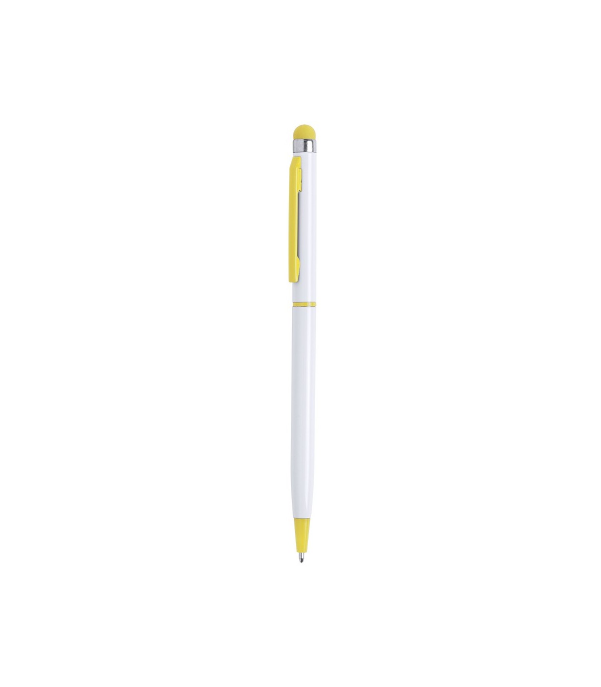 Económicos bolígrafos punteros para usar con smartphones, fabricado en aluminio de color blanco con accesorios de colores, para personalizar y regalar.