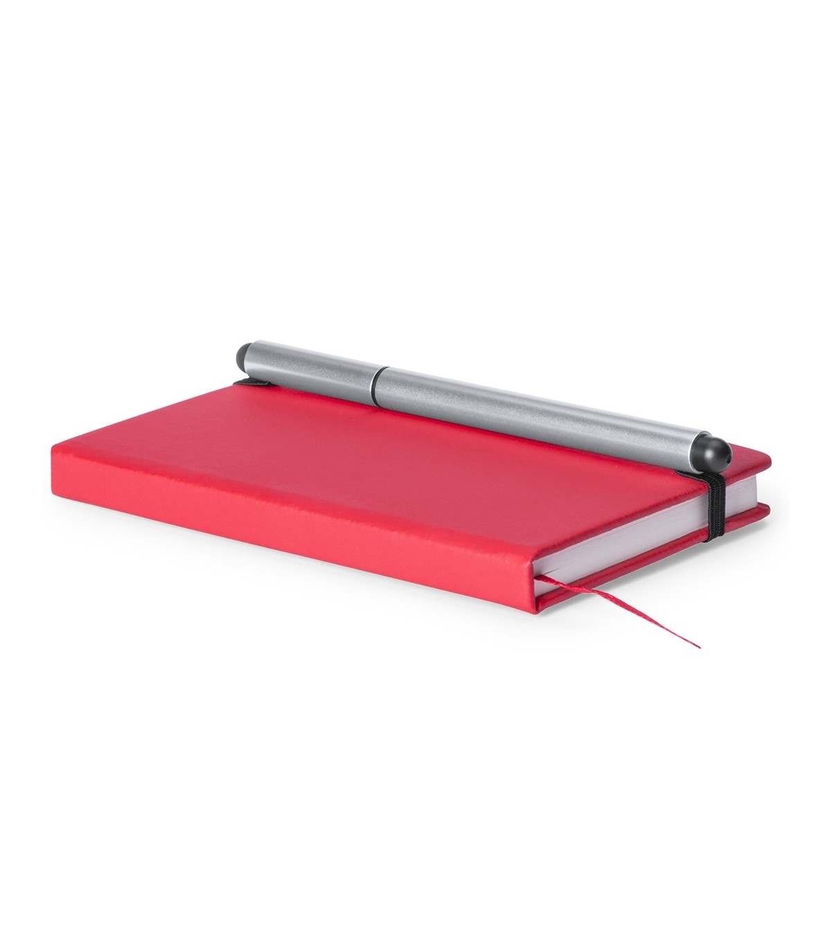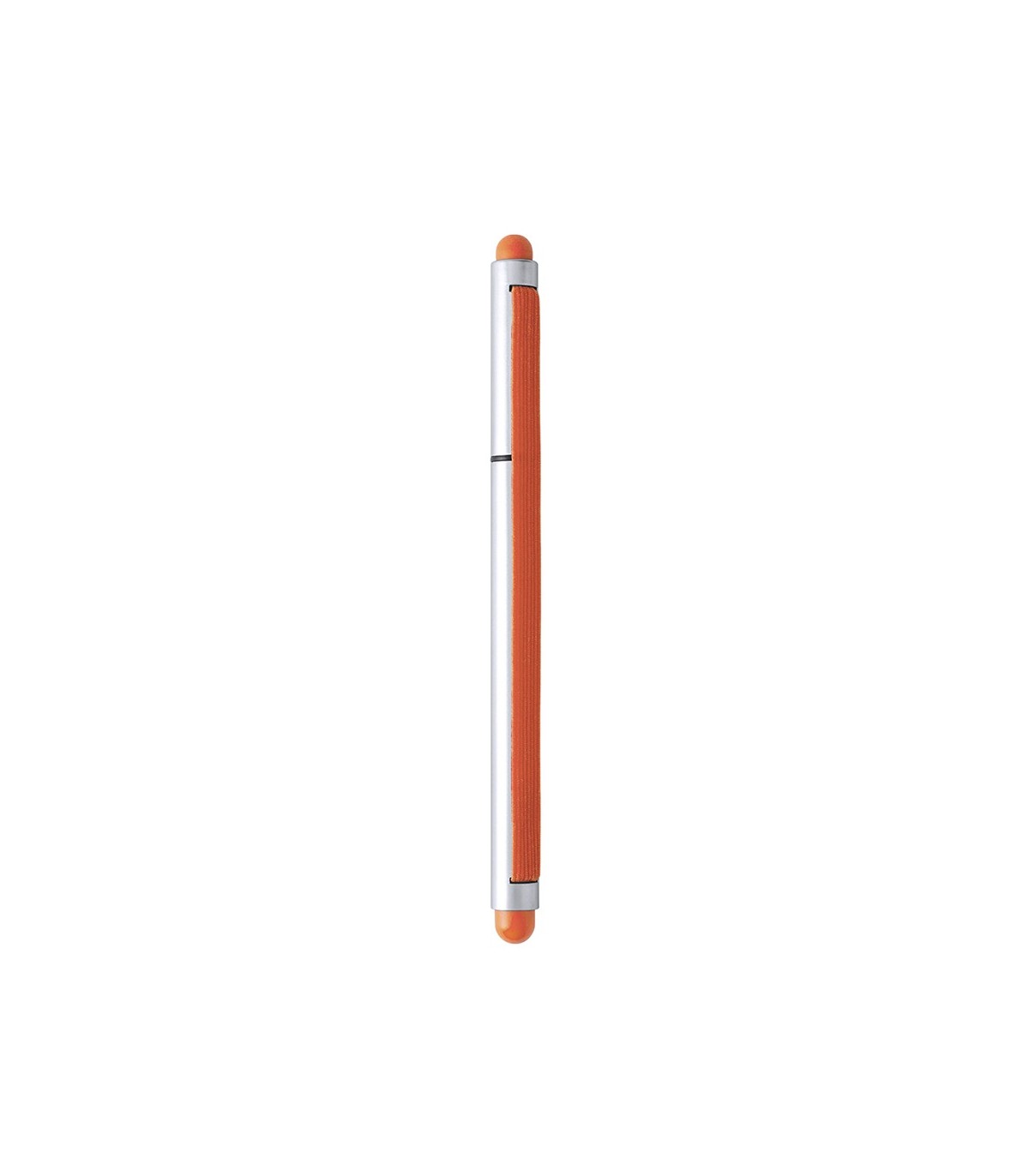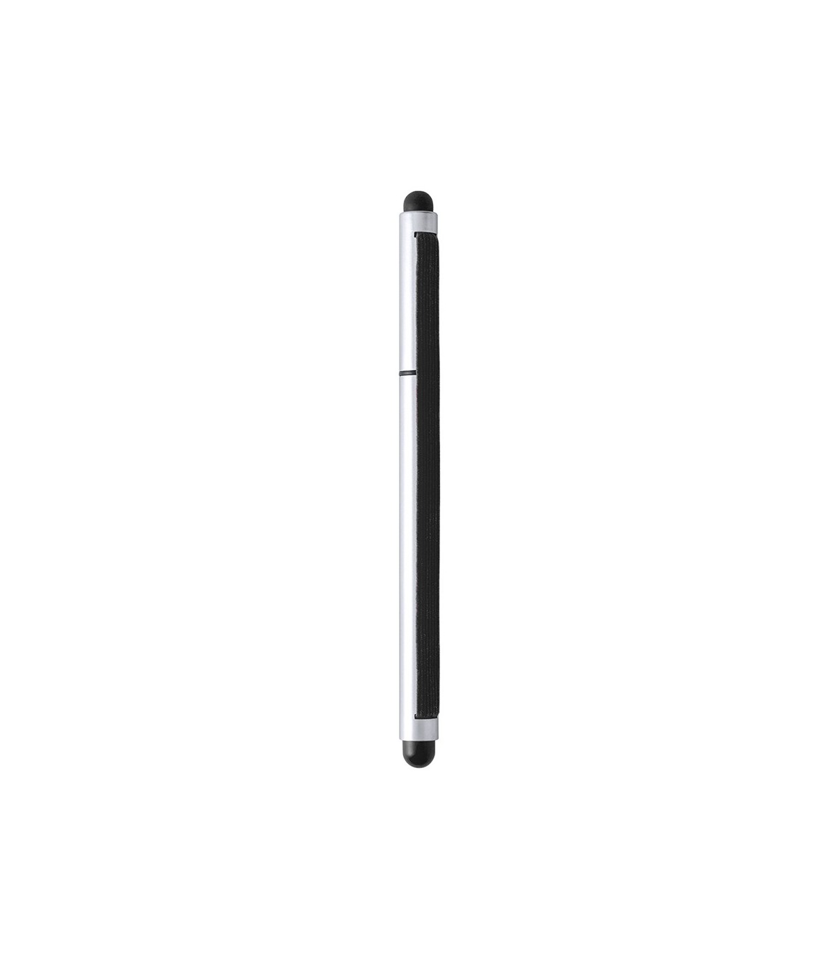 Original bolígrafo con doble puntero y cinta elástica de unión entre cuerpo y capucha. De original diseño bicolor y cuerpo de suave acabado en color plateado, está especialmente diseñado como complemento para bloc de notas o dispositivos móviles gracias a su práctico sistema de fijación.