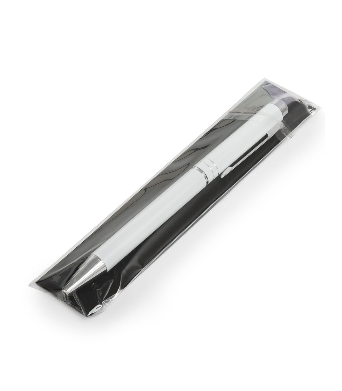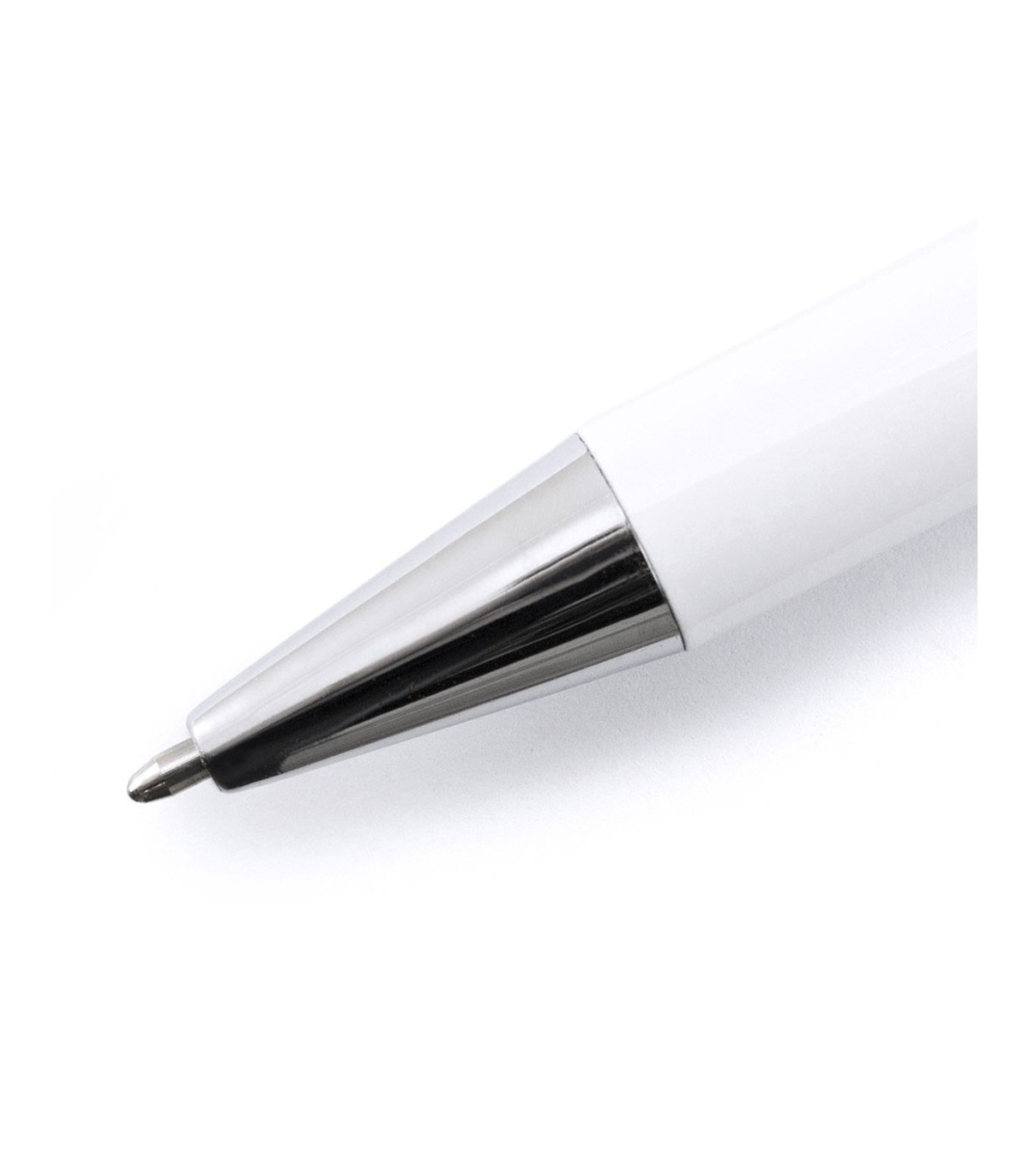Bolígrafo puntero de apertura con sistema giratorio con cuerpo en aluminio de suave acabado metalizado en variados colores. Accesorios y anillas en color plateado. Escritura en tinta de color azul.
