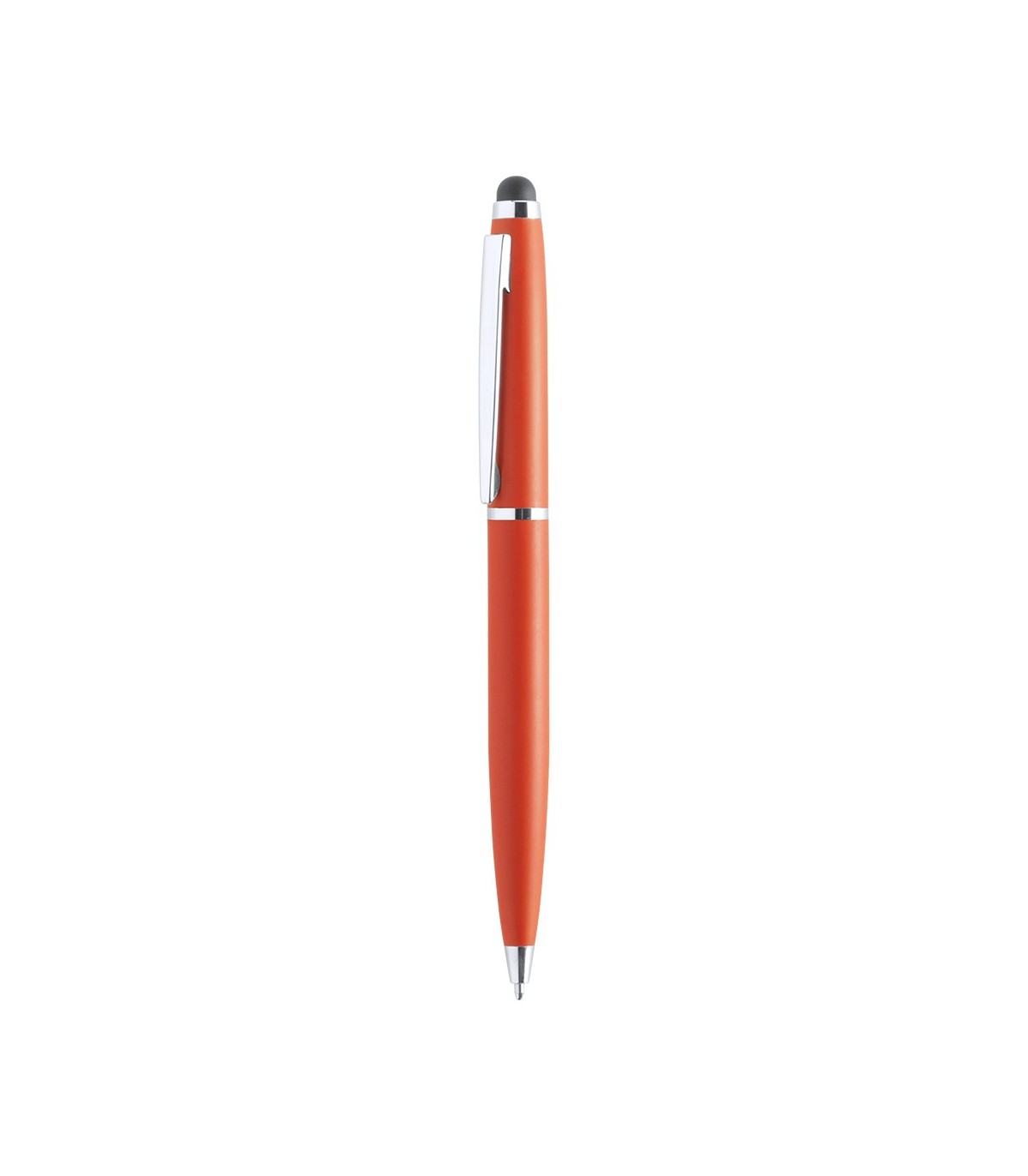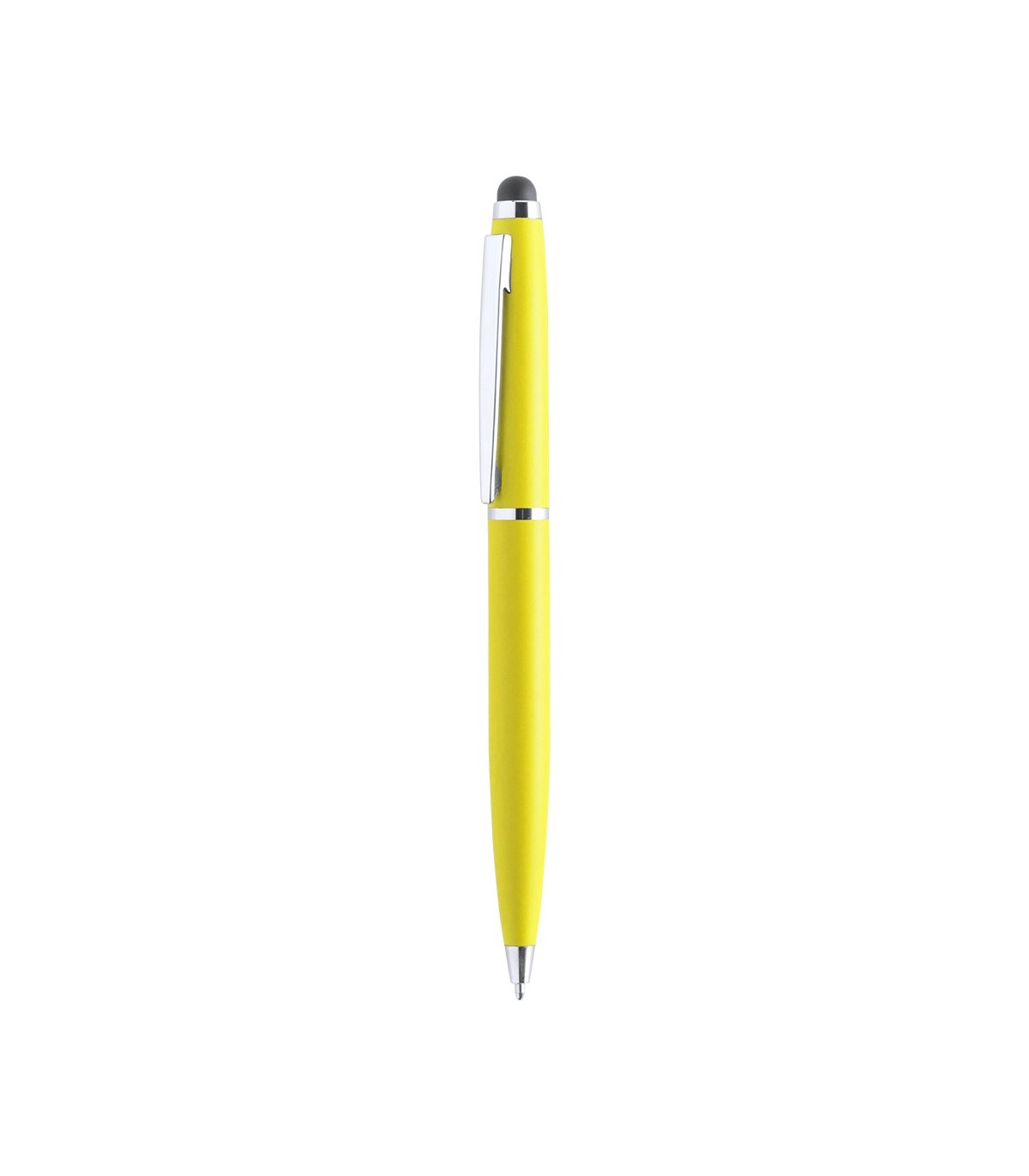 Bolígrafo puntero de apertura con sistema giratorio con cuerpo metálico de suave acabado en alegres colores. Accesorios y anillas en color plateado. Escritura en tinta de color azul.