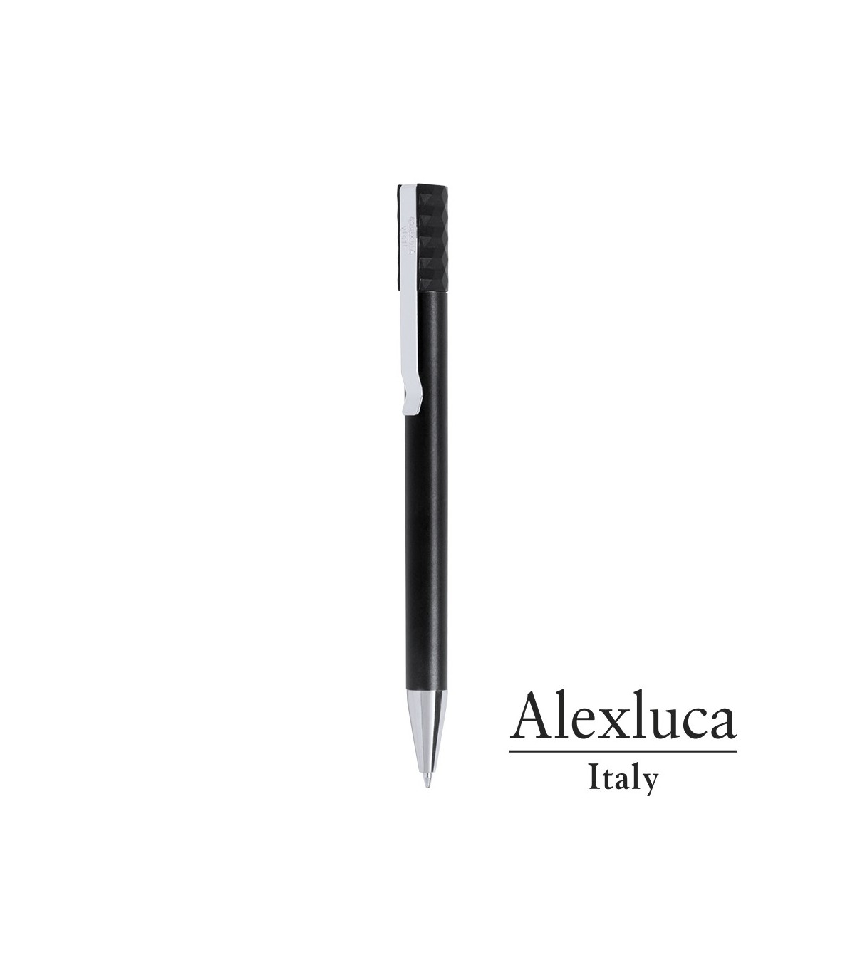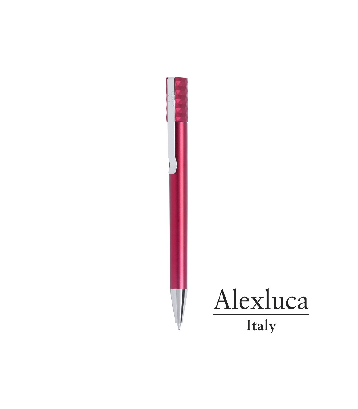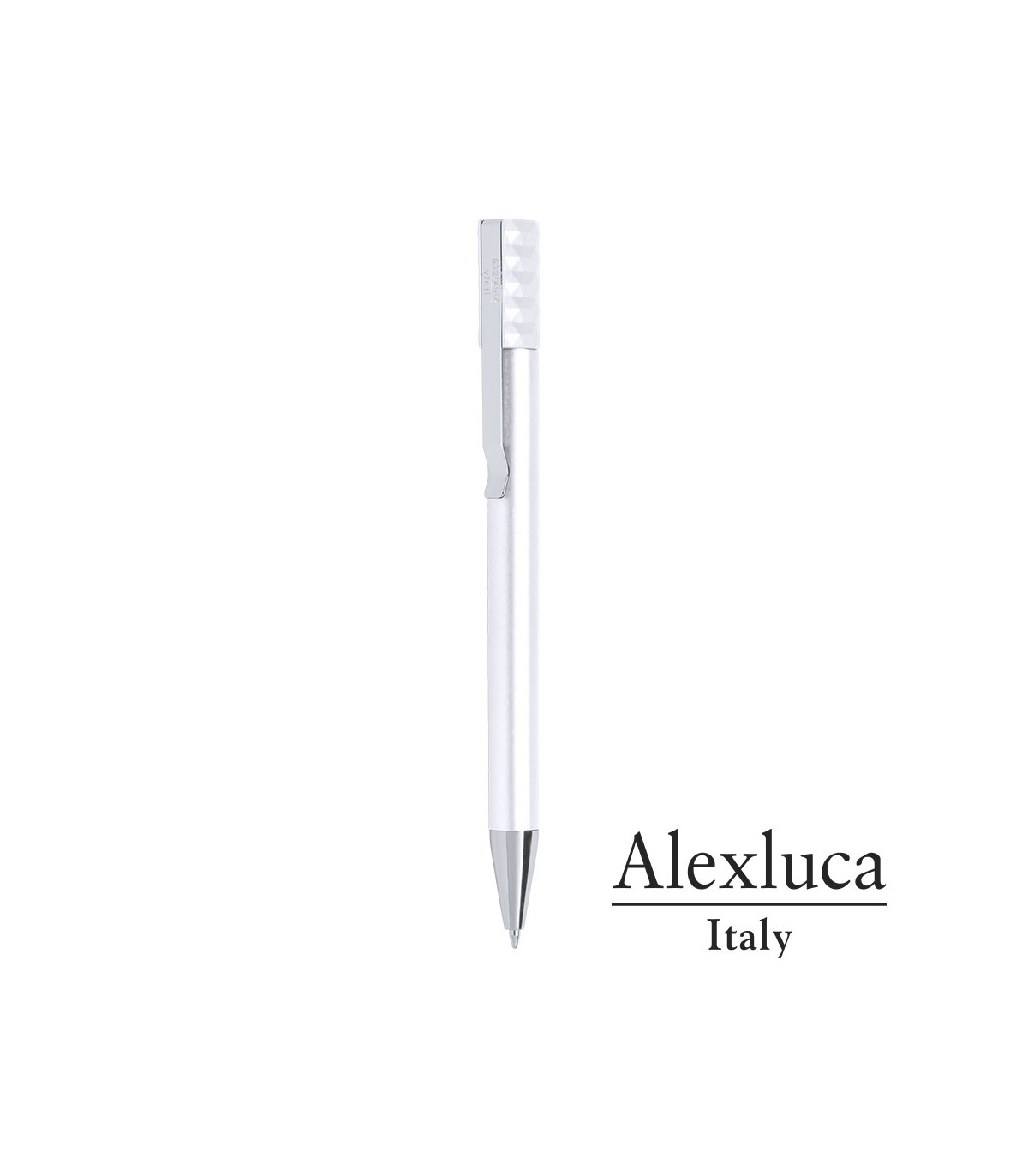 Bolígrafo de Alexluca con cuerpo en colores metalizados y accesorios en color plateado brillante. Clip metálico con logotipo de la marca y tinta azul.