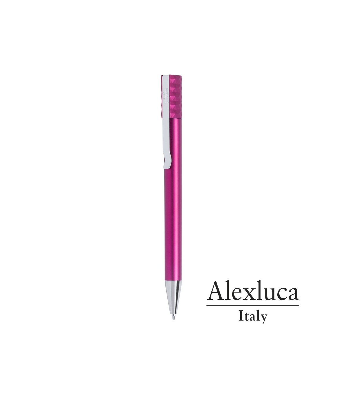 Bolígrafo de Alexluca de mecanismo pulsador con cuerpo en variada gama de colores metalizados y accesorios en color plateado brillante. Clip metálico con logotipo de la marca y tinta azul.