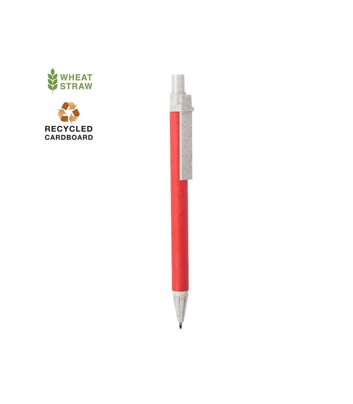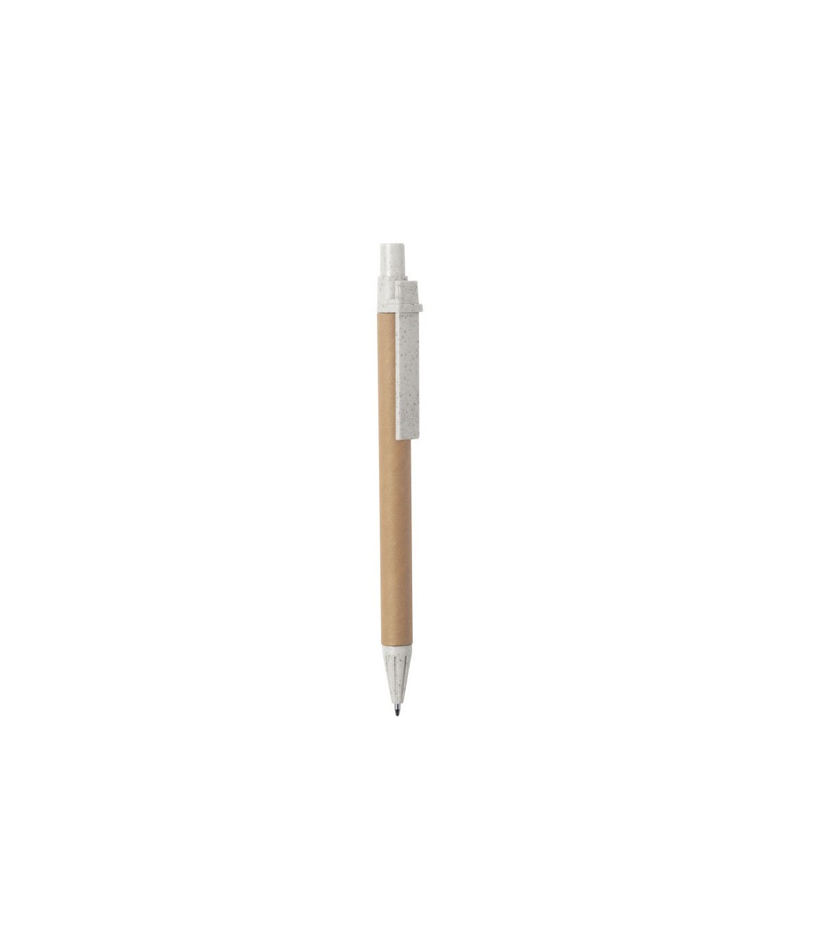 Bolígrafo con mecanismo pulsador y fabricación ecológica. Cuerpo en cartón reciclado, con accesorios en caña de trigo, para así fomentar la utilización de materias primas naturales y reducir las emisiones contaminantes. Disponible en diversa gama de colores y en tinta azul.