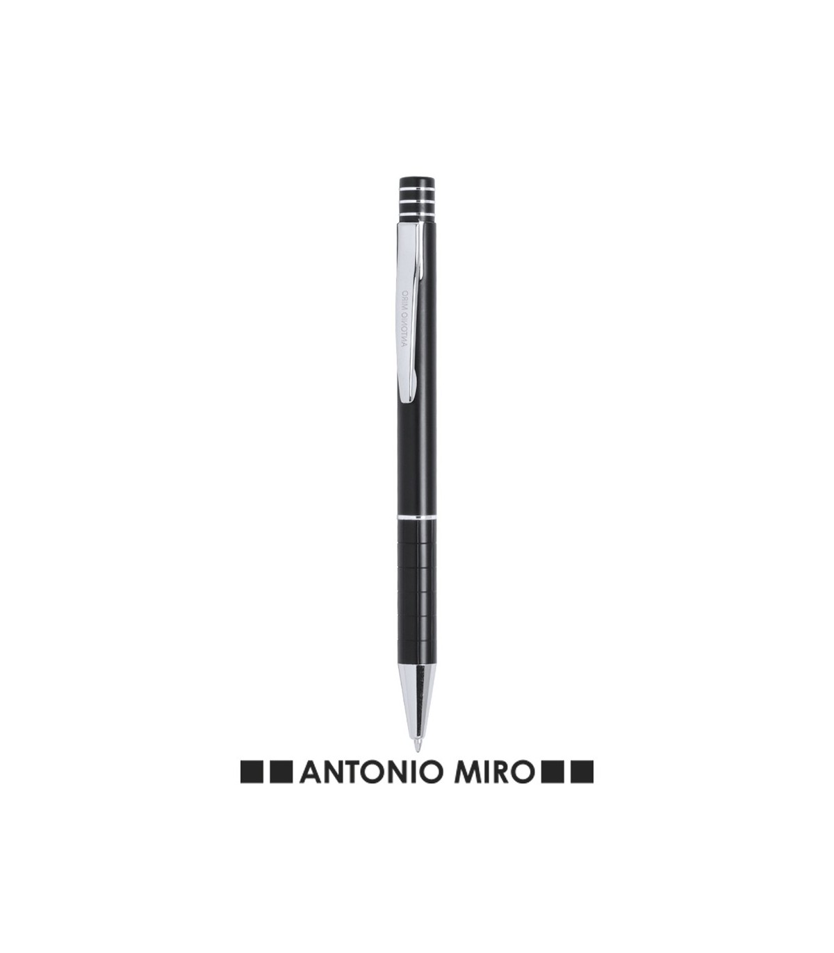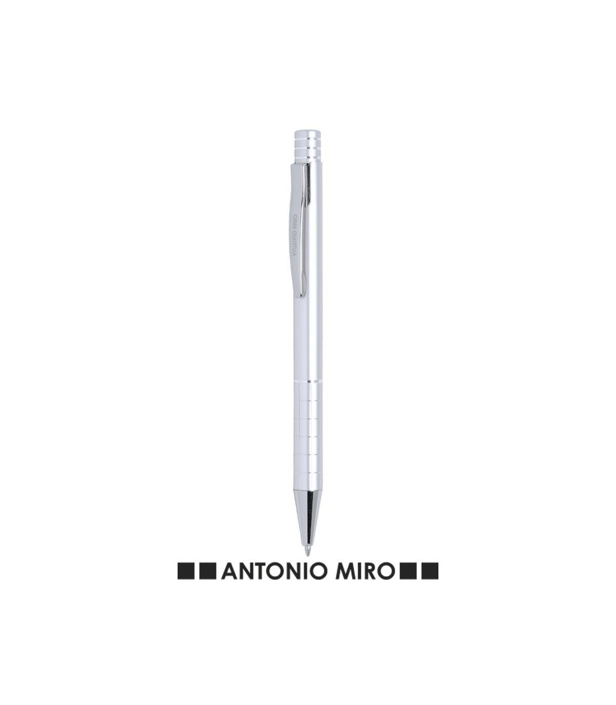 Bolígrafos de Antonio Miró de cuerpo en aluminio con accesorios en color plateado, con parte superior anillada, original clip metálico y con logotipo de la marca.