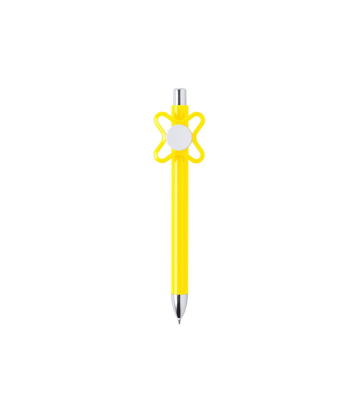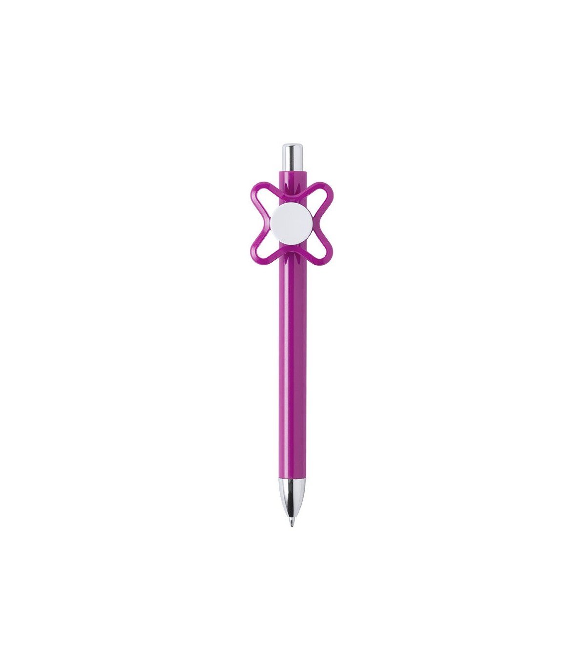 Original bolígrafo spinner antiestrés de apertura con mecanismo pulsador y divertido diseño con accesorios en color plateado y cuerpo de acabado sólido en colores brillantes. Especialmente diseñado para tampografía en clip y en cuerpo. De cartucho jumbo y en tinta azul.