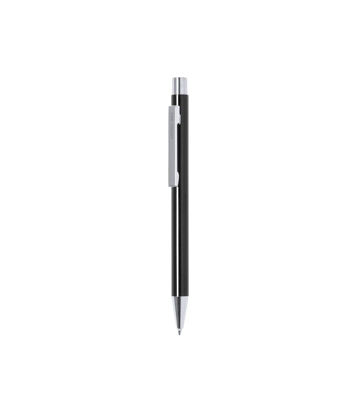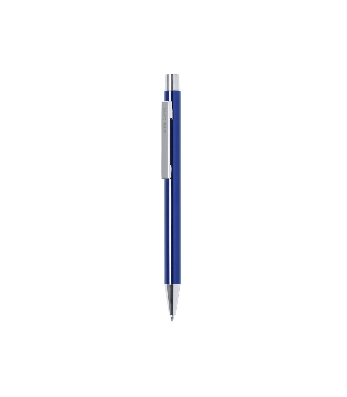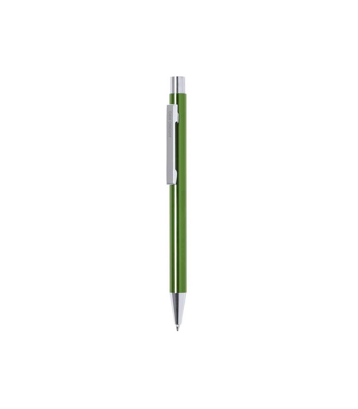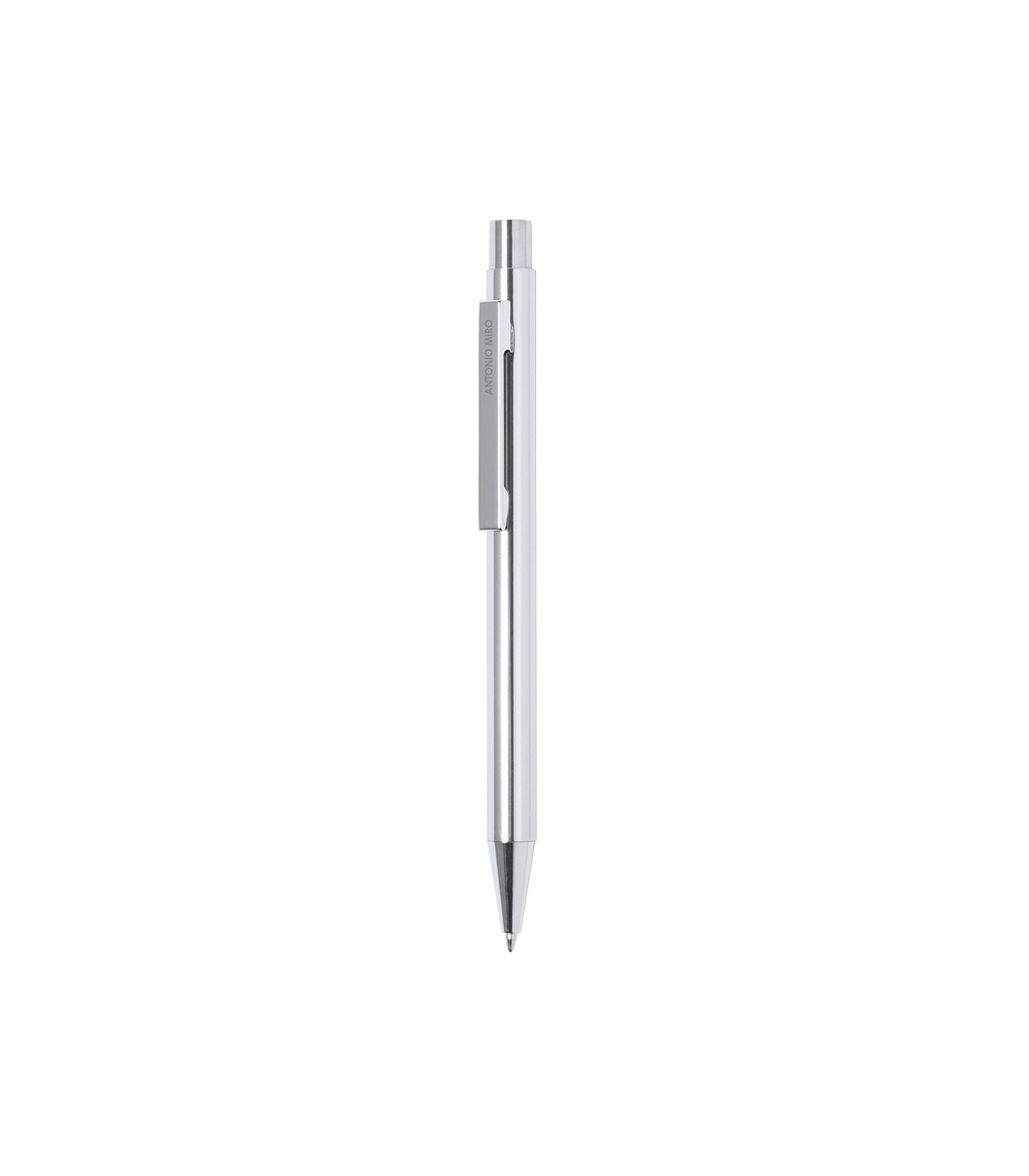 Bolígrafo diseñados por Antonio Miró en aluminio de llamativos colores y en color plateado. De mecanismo pulsador y presentado en bolsita con logotipo de la marca. Tinta azul.
