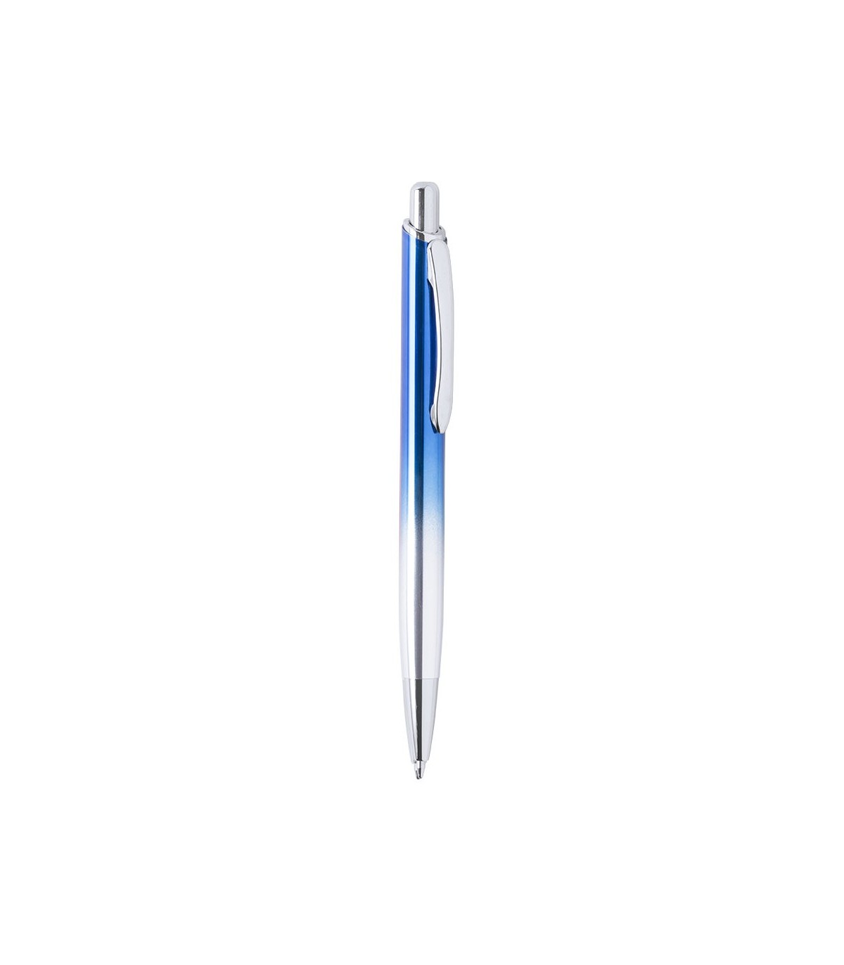 Atrevido bolígrafo de aluminio metalizado con mecanismo pulsador y detalles en color plateado. Cuerpo en combinación de llamativos colores degradados con tonos plateados brillantes. Especialmente diseñado para marcaje en láser y con un recubrimiento exterior especial para que tu publicidad quede perfectamente grabada en color plateado brillante, a juego con el resto de accesorios del bolígrafo. Escritura en tinta de color azul.