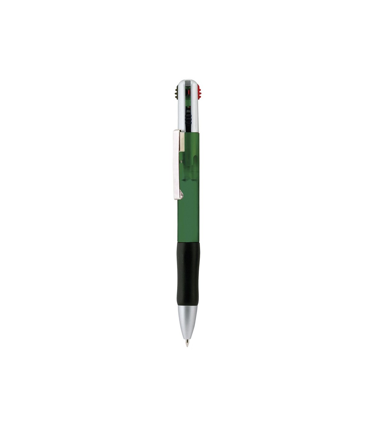 Bolígrafo 4 en 1 de apertura con mecanismo pulsador retráctil, de clásico diseño y cuerpo de suave acabado translúcido en llamativos colores. Con accesorios en plateado y suave empuñadura ergonómica en color negro. De 4 cartuchos en tintas azul, roja, negra y verde.