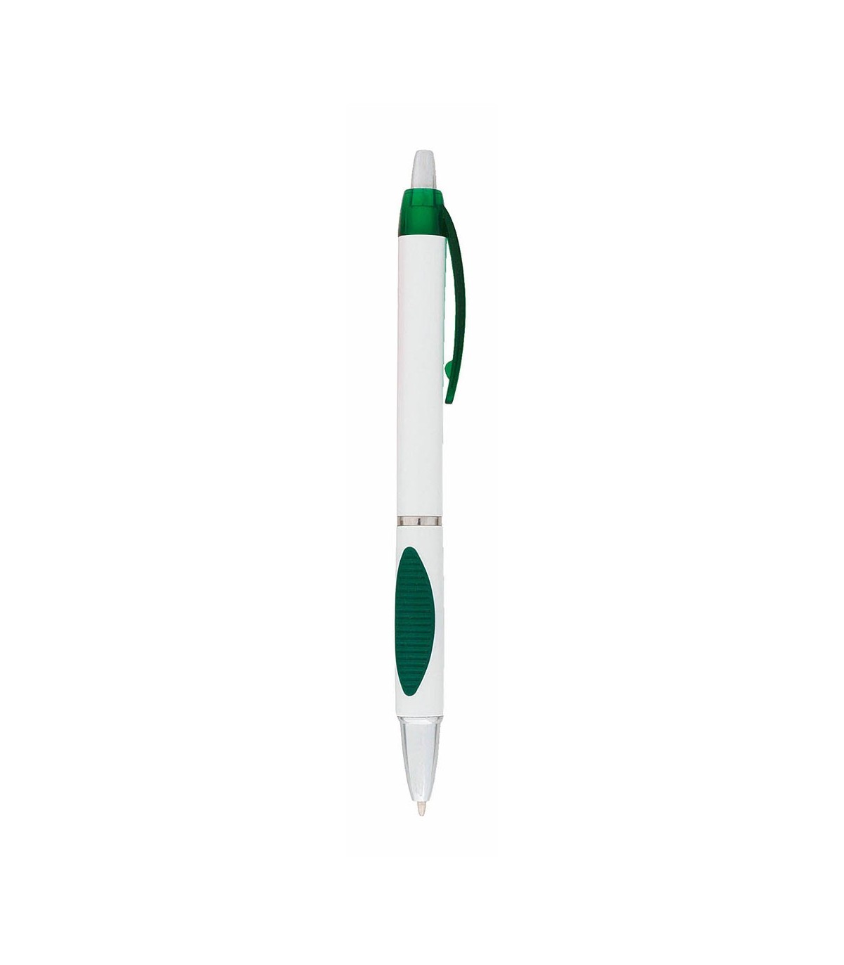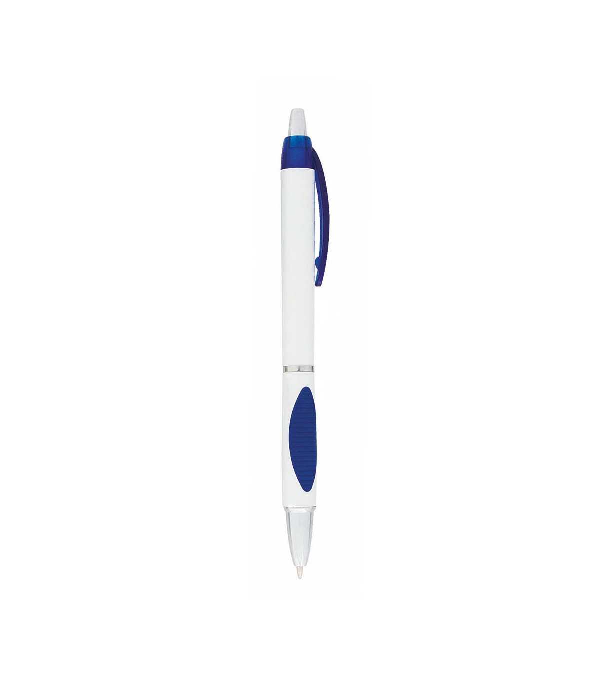 Bolígrafo de apertura con mecanismo pulsador y atrevido diseño bicolor con accesorios en colores translúcidos y cuerpo de suave acabado en color blanco sólido. Con original clip a juego. Escritura en tinta de color azul.