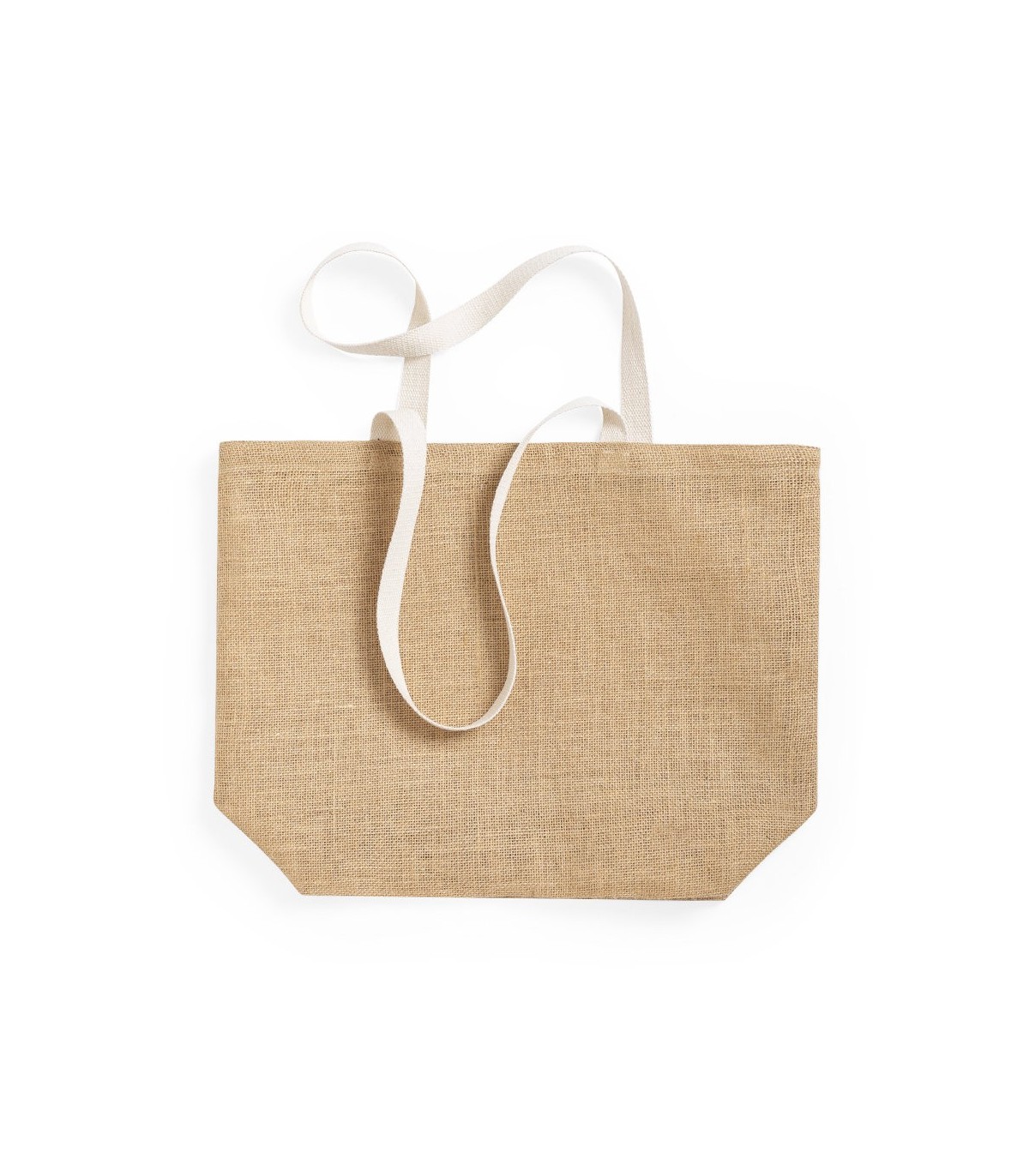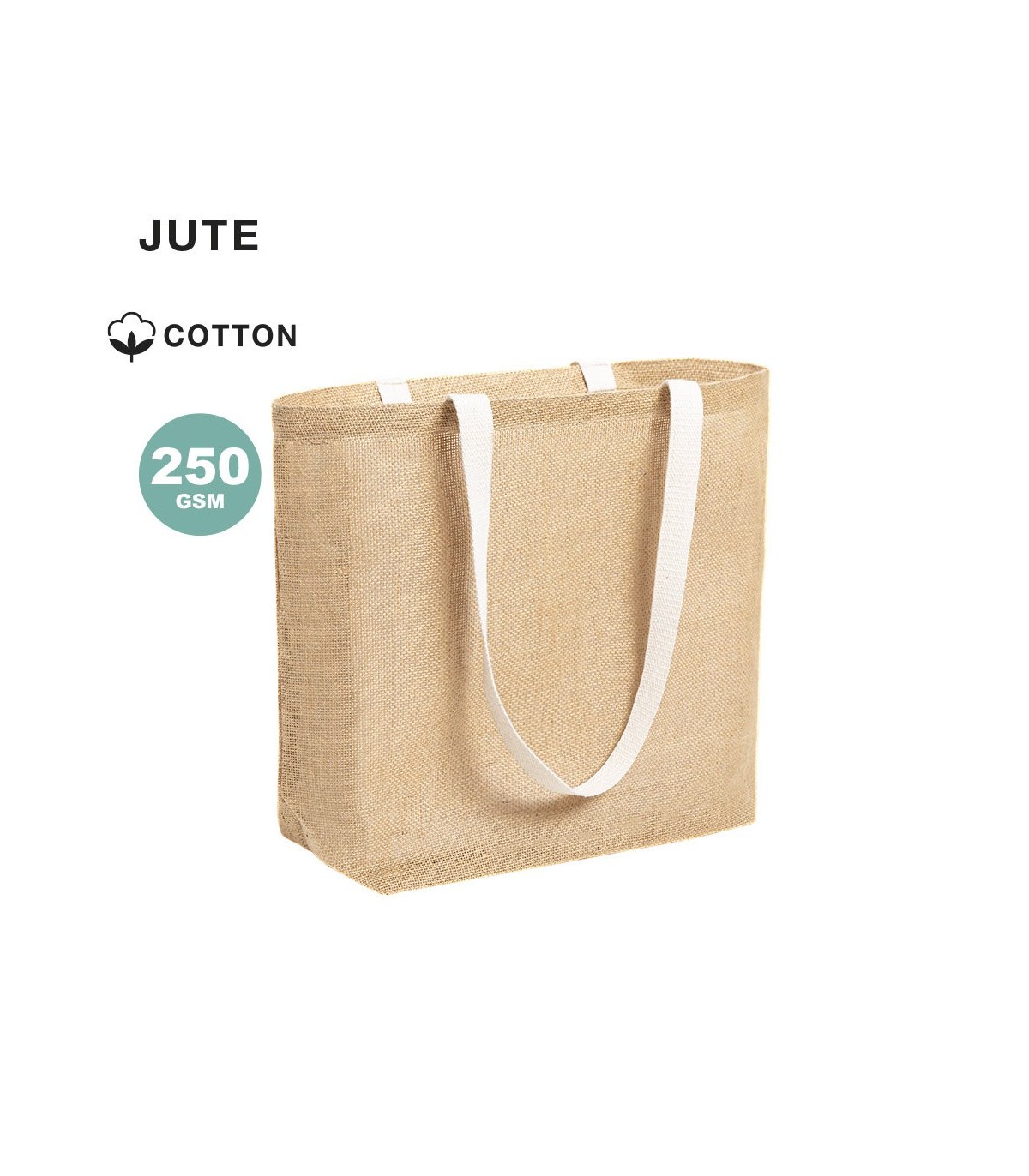 Bolsas de yute (250g/m²). Con asas de algodón largas en color natural y reforzadas. Con terminación cosida, con fuelle en la base y resistencia hasta 8kg de peso.