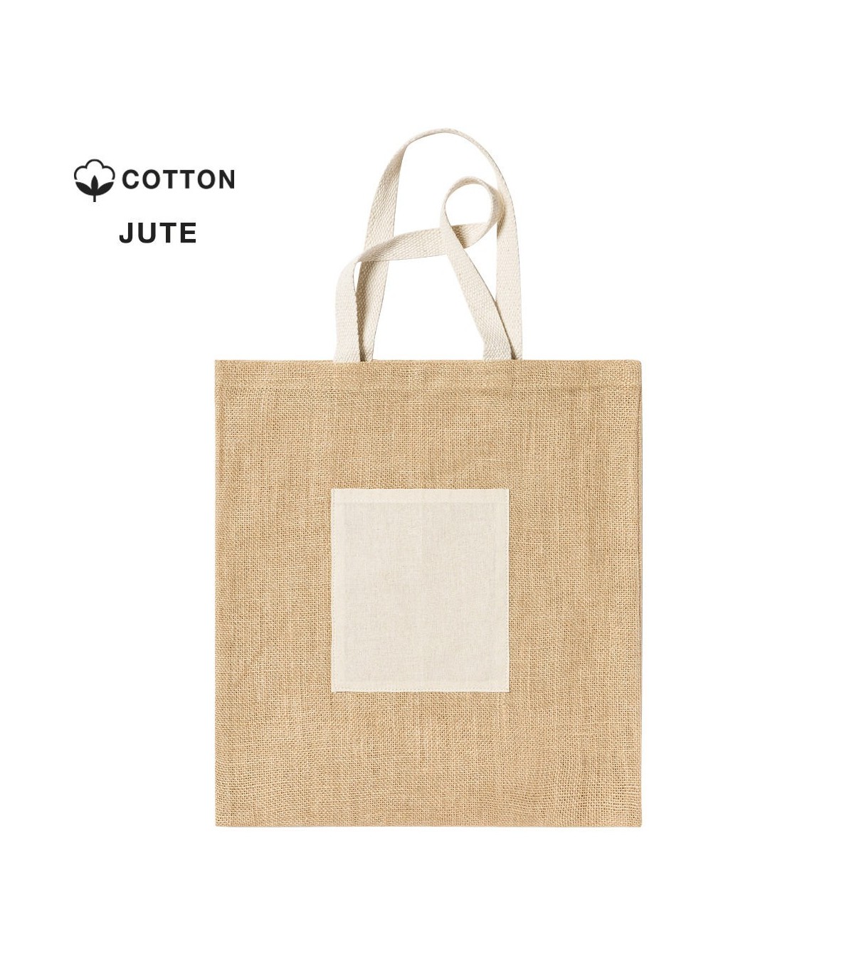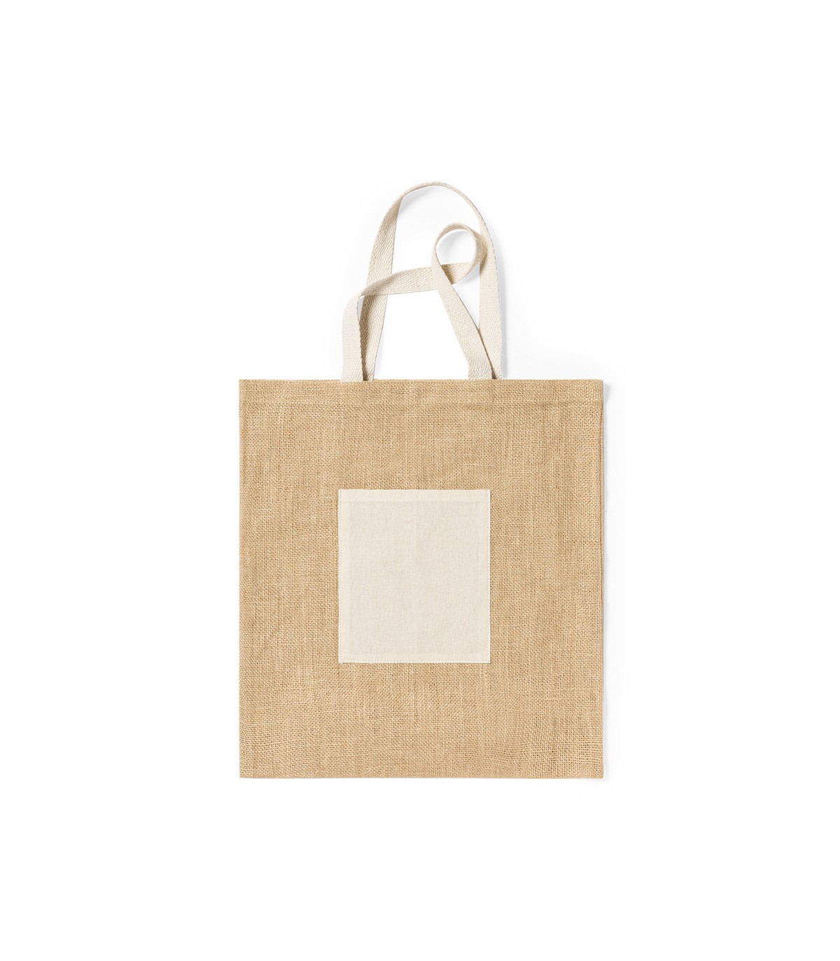 Bolsas publicitarias de yute de 240 g/m² y asas de algodón, todo en tono natural. Con terminación cosida y con asas medianas reforzadas. Bolsillo frontal de algodón.