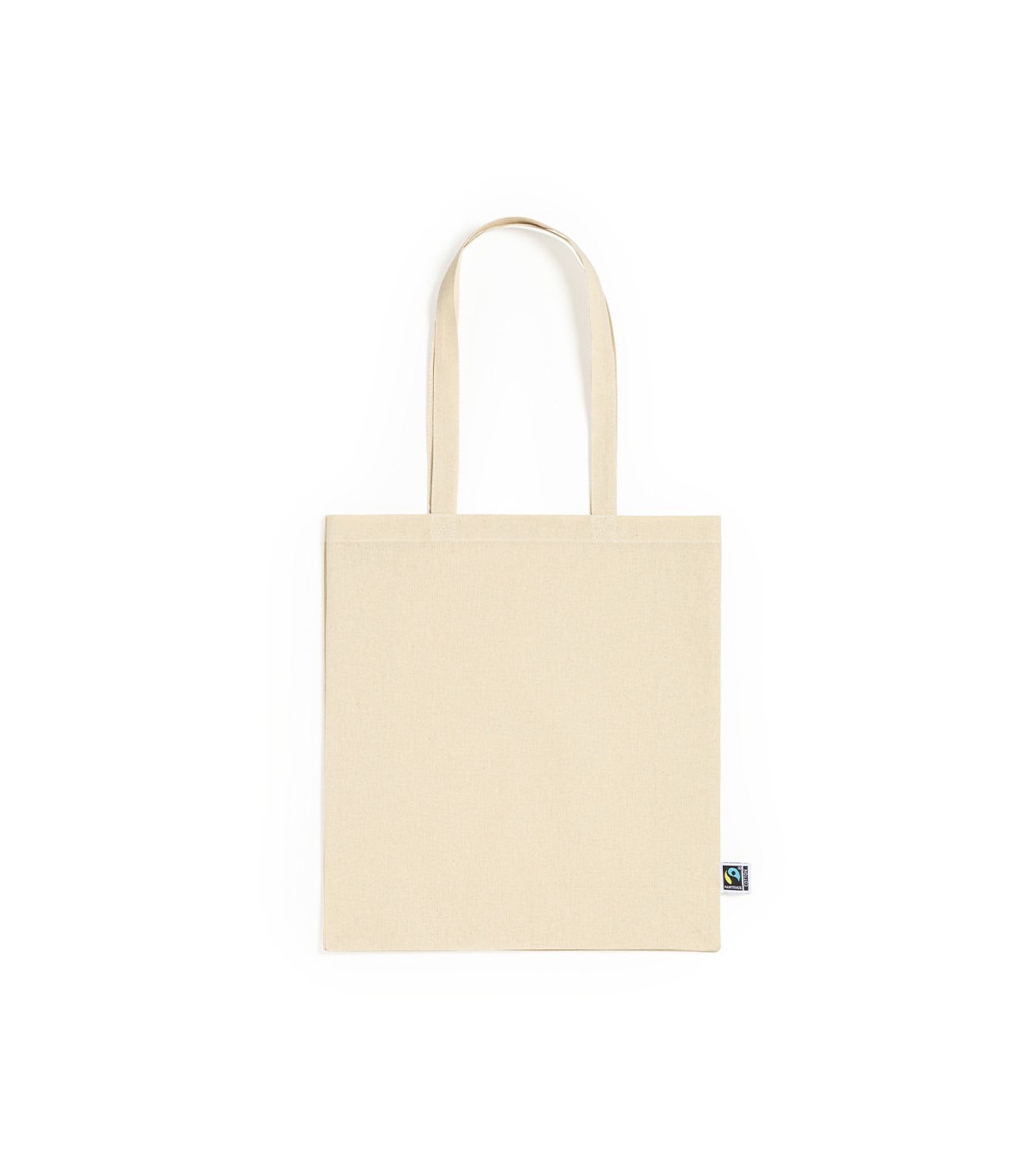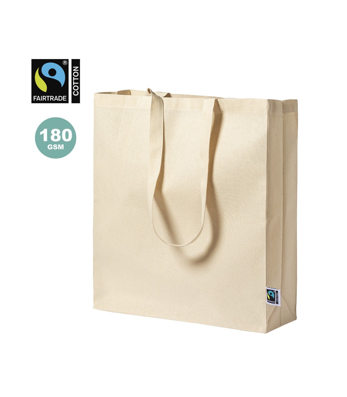 Bolsas de fabricación ecológica, hechas en 100% algodón de 180 g/m² en tono natural. Con certificación Fairtrade (Comercio Justo) un sistema comercial solidario y alternativo al convencional que persigue el desarrollo de los pueblos y la lucha contra la pobreza. De acabado cosido con fuelle, asas largas reforzadas de 70cm y resistencia hasta 7kg de peso. Incluida etiqueta Fairtrade y hangtag distintivo en cartón reciclado.