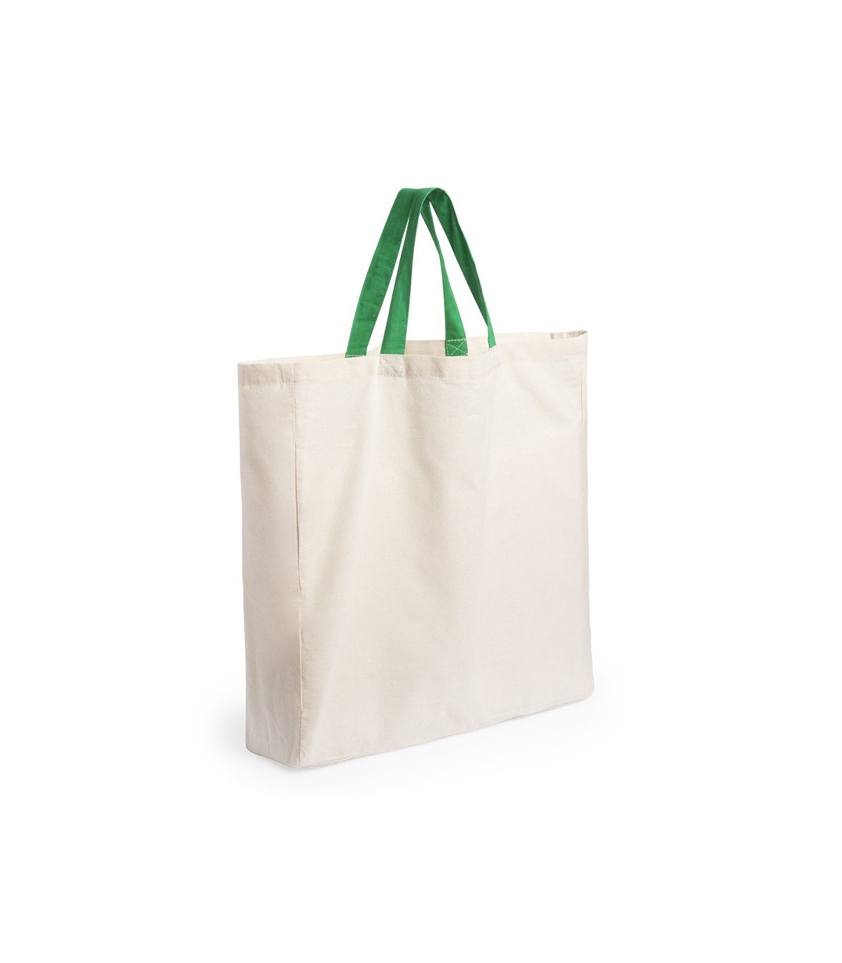 Bolsas en material 100% algodón orgánico con acabado en color natural. Con asas cortas reforzadas de 35cm en color verde, fuelle y acabado cosido. Con capacidad de almacenaje de hasta 9kg de peso.