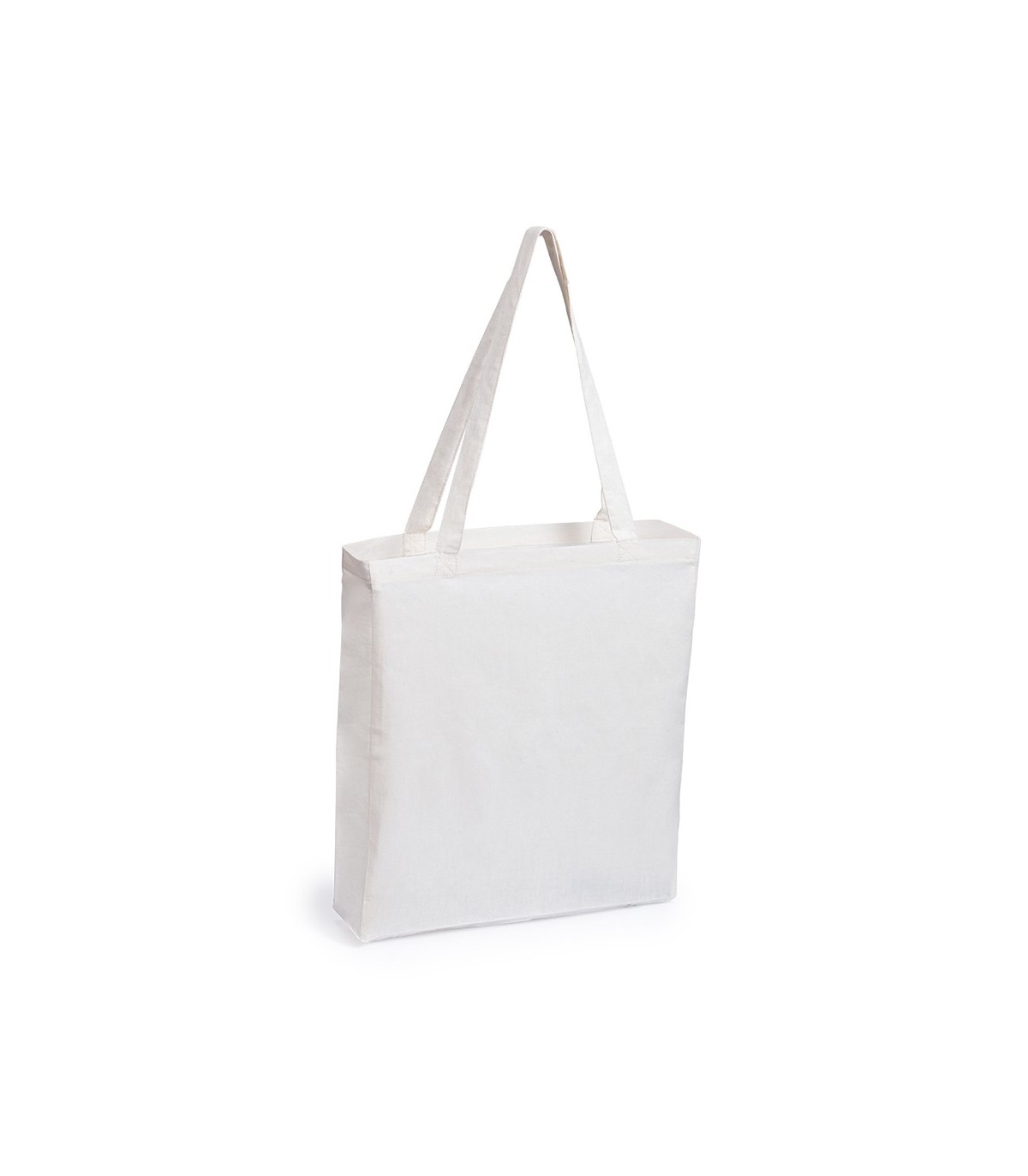 Bolsas en material 100% algodón con acabado en color natural. Con asas largas reforzadas de 70cm, fuelle y acabado cosido. Con capacidad de almacenaje de hasta 7kg de peso.
