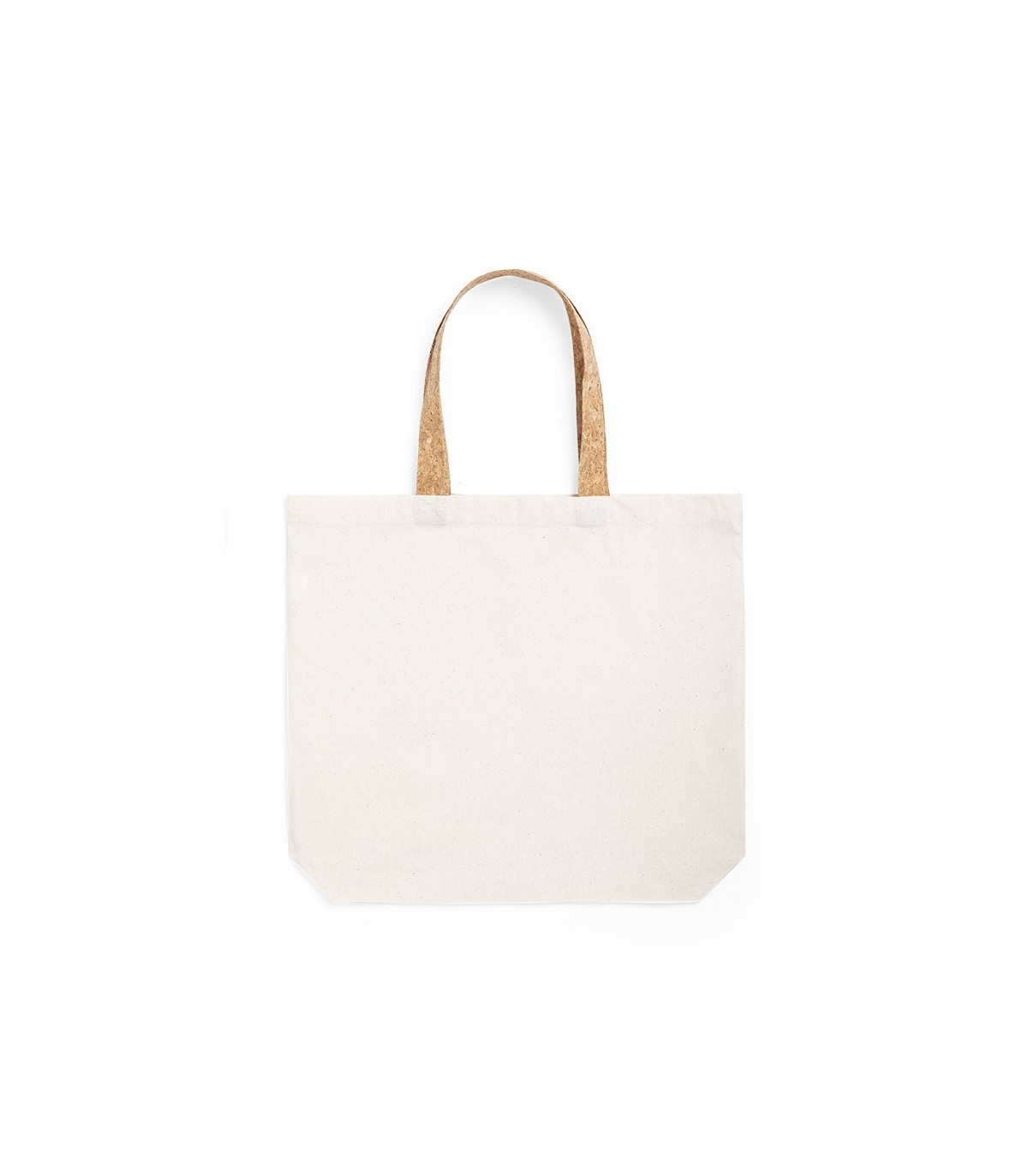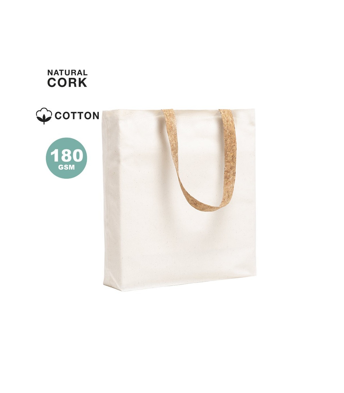 Bolsas personalizadas con tu logo, hechas algodón de 180 g/m² y corcho natural con asas de 53cm reforzadas. Acabado cosido y resistencia hasta 8kg de peso.