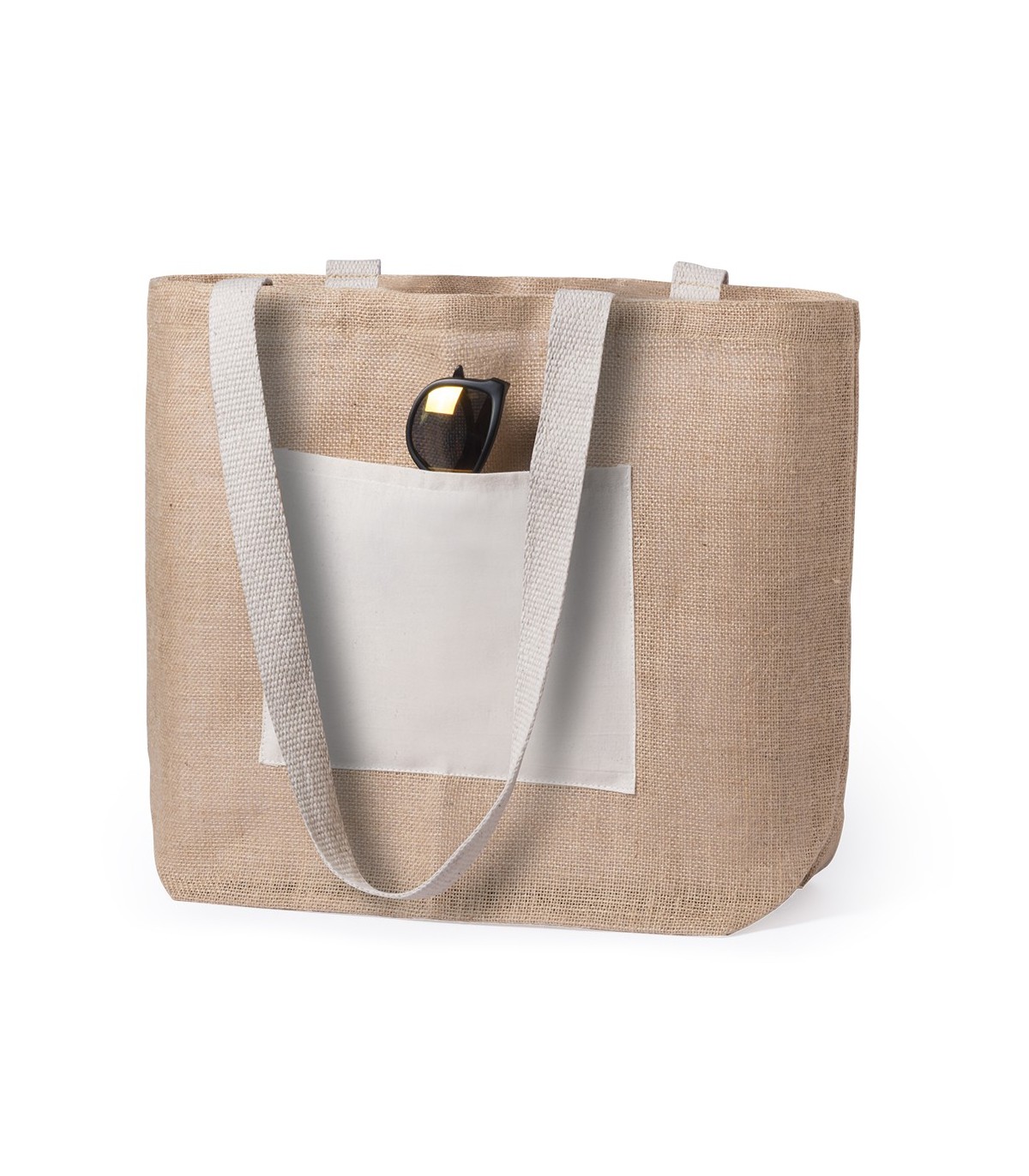 Bolsa de yute con bolsillo frontal de algodón. Asas de algodón largas en color blanco y reforzadas. Con fuelle, Con terminación cosida.