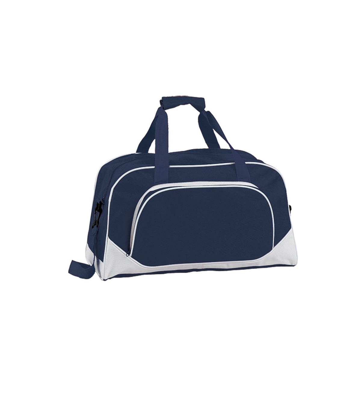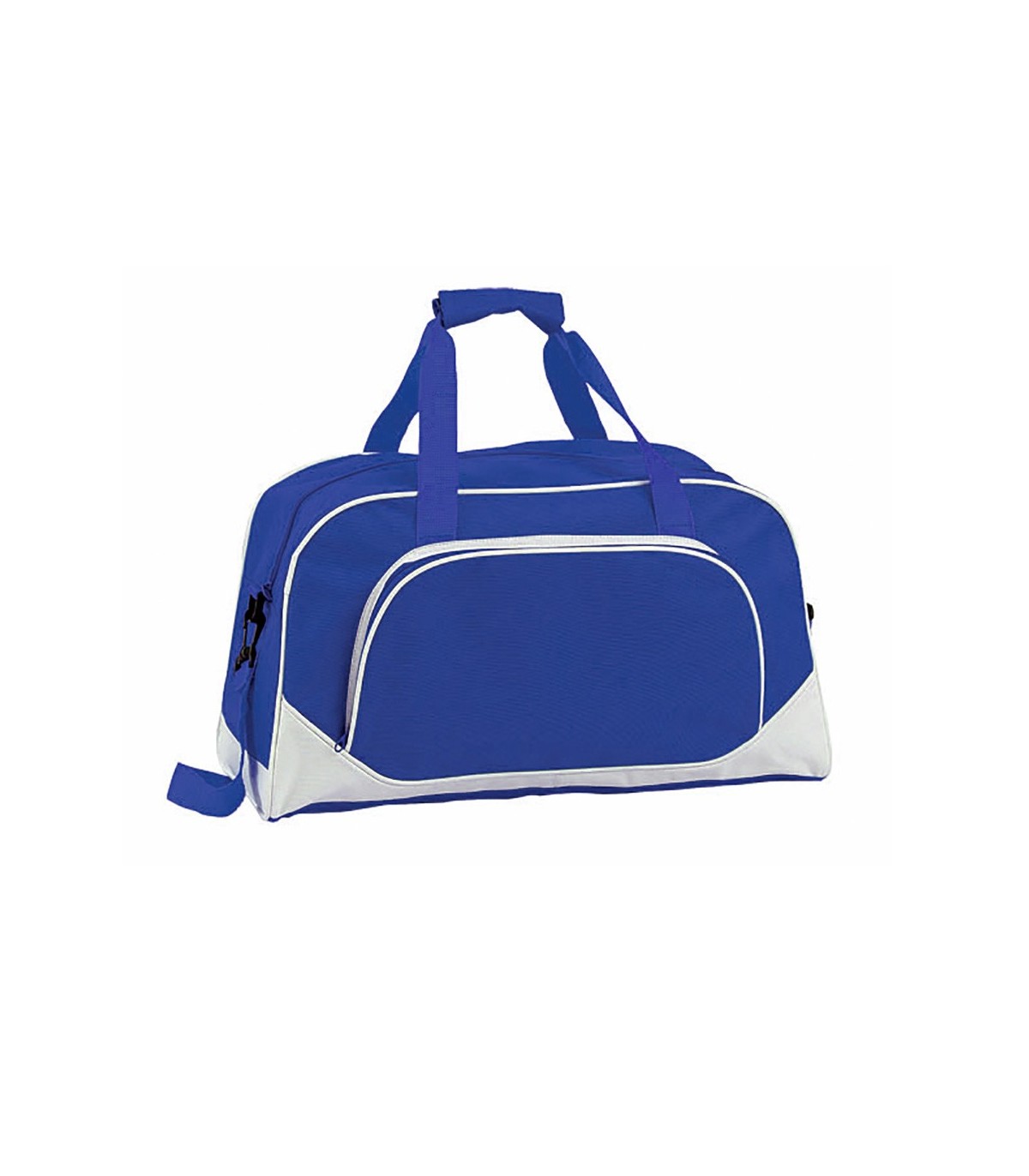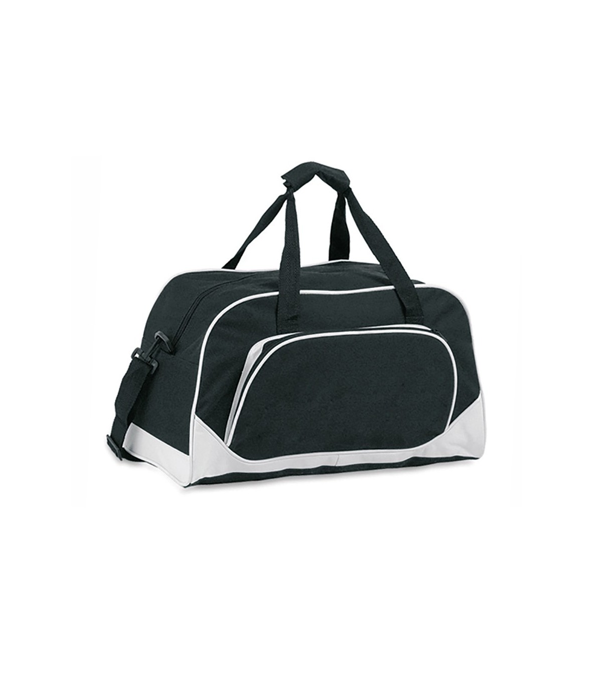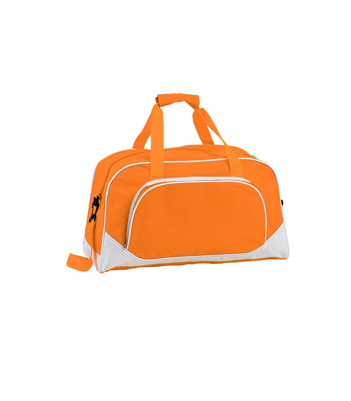 Bolso multiusos en resistente poliéster 600D de desenfadado diseño bicolor en amplia gama de colores, con ribetes de refuerzo y base en color blanco. Compartimento principal y bolsillo exterior con cierre de cremallera a juego. Con resistentes asas de nylon a juego con cierre de velcro y cinta bandolera ajustable de doble cierre de mosquetón.