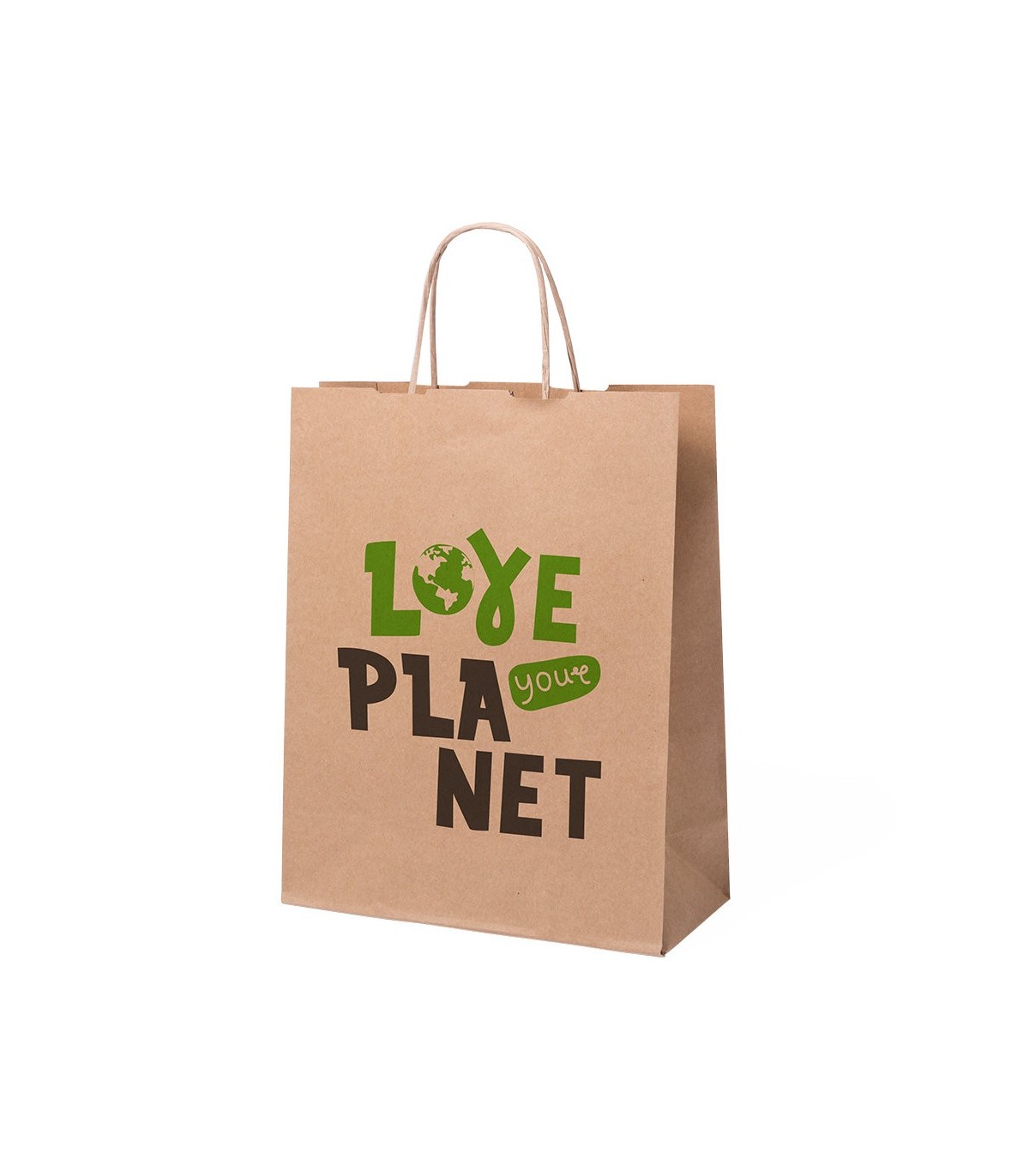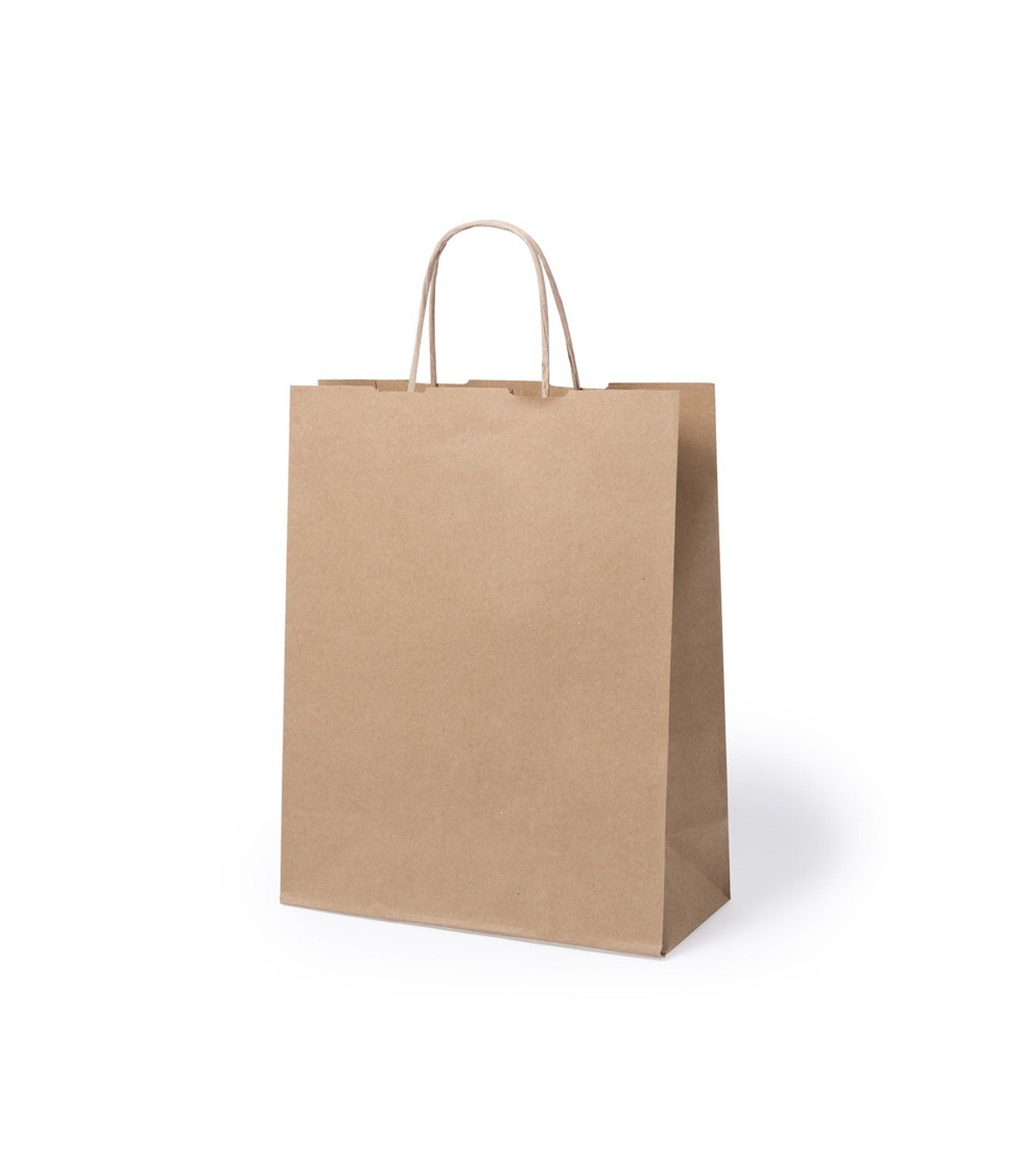 Bolsas en papel de acabado natural de 100 g/m² con asas cortas reforzadas y fuelle. Con capacidad de almacenaje de hasta 7kg de peso.
