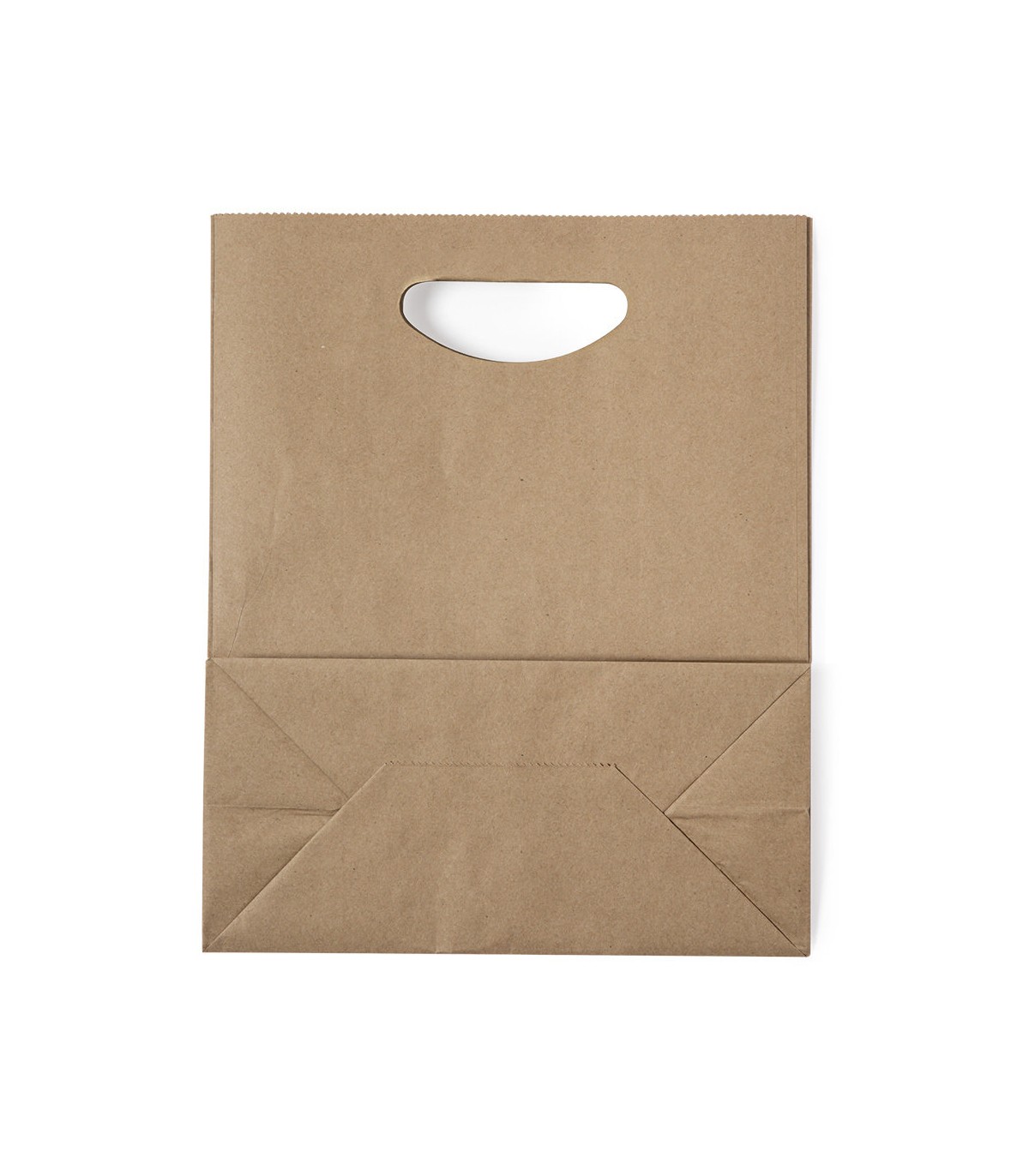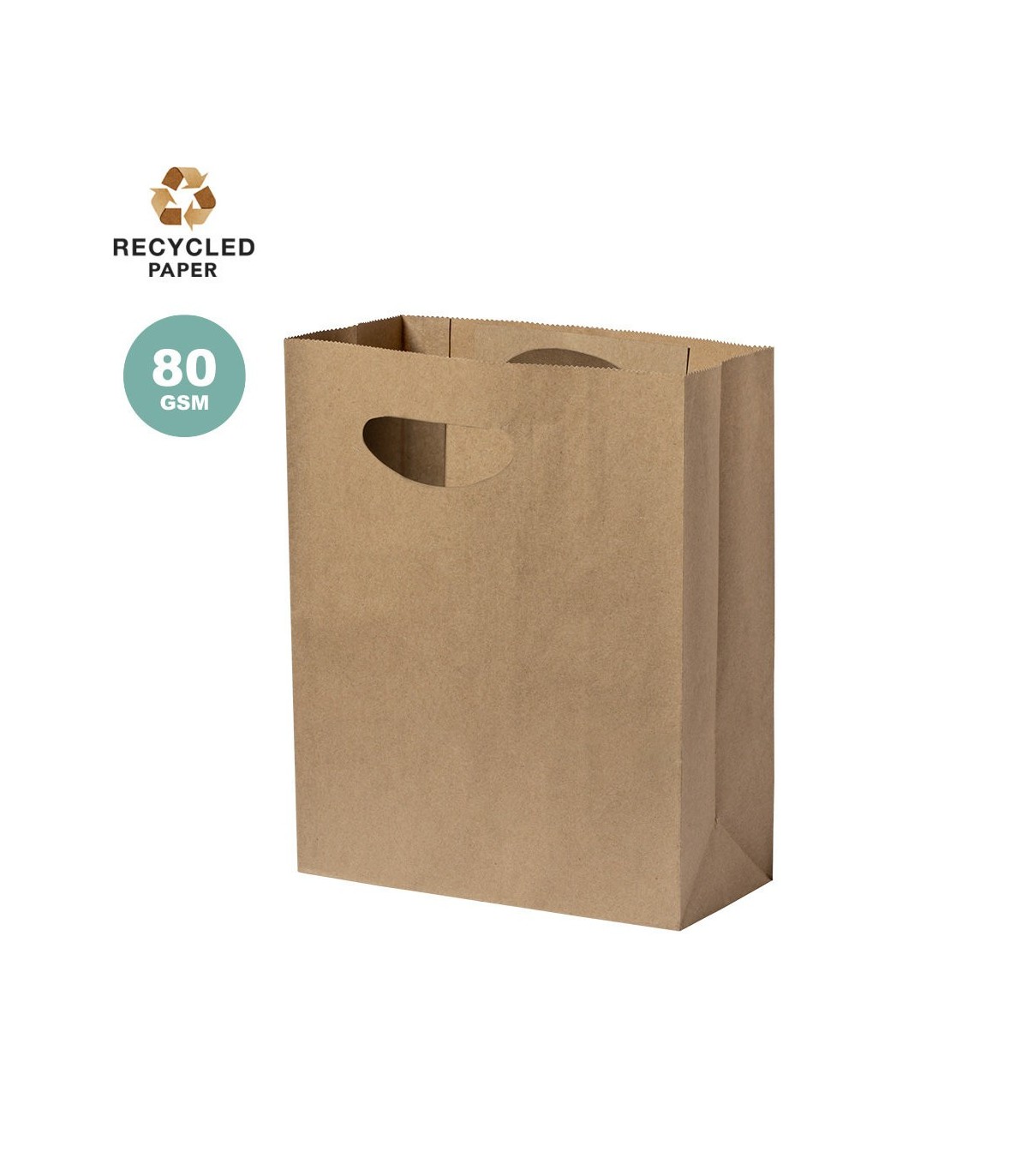 Bolsas de papel reciclado de 80 g/m² personalizadas ideales para tiendas y comercios, con original asa troquelada y fuelle.
