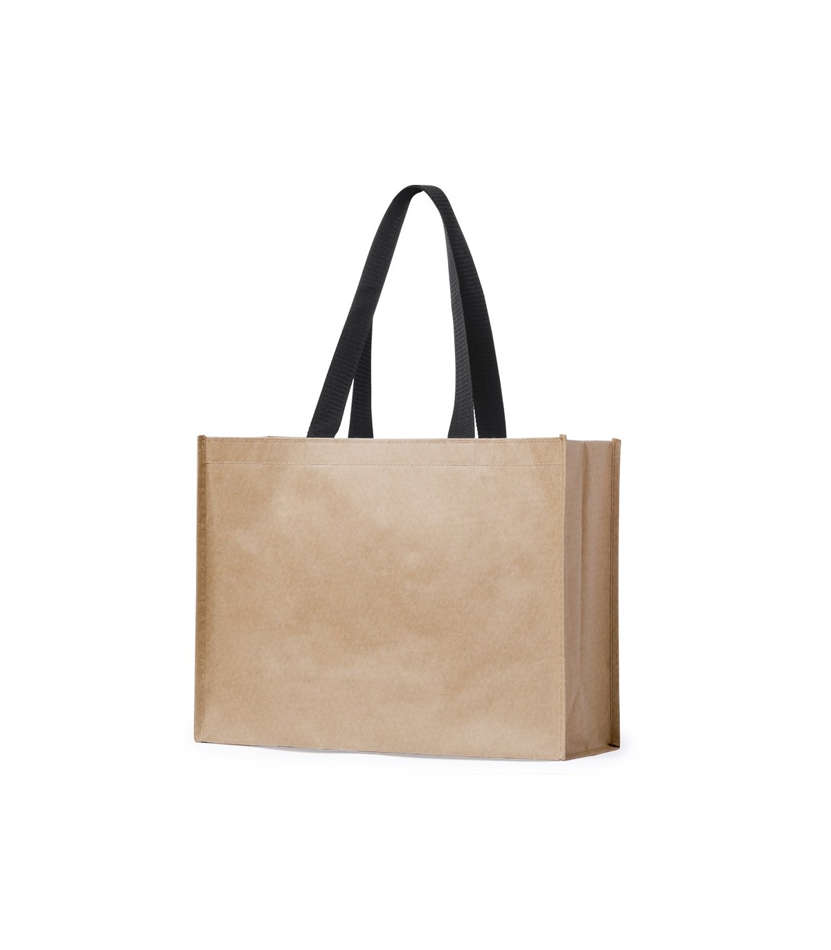 Originales bolsas promocionales de papel y tela no tejida 140g/m². En acabado cosido, con asas largas de 60 cm reforzadas en contraste negro.