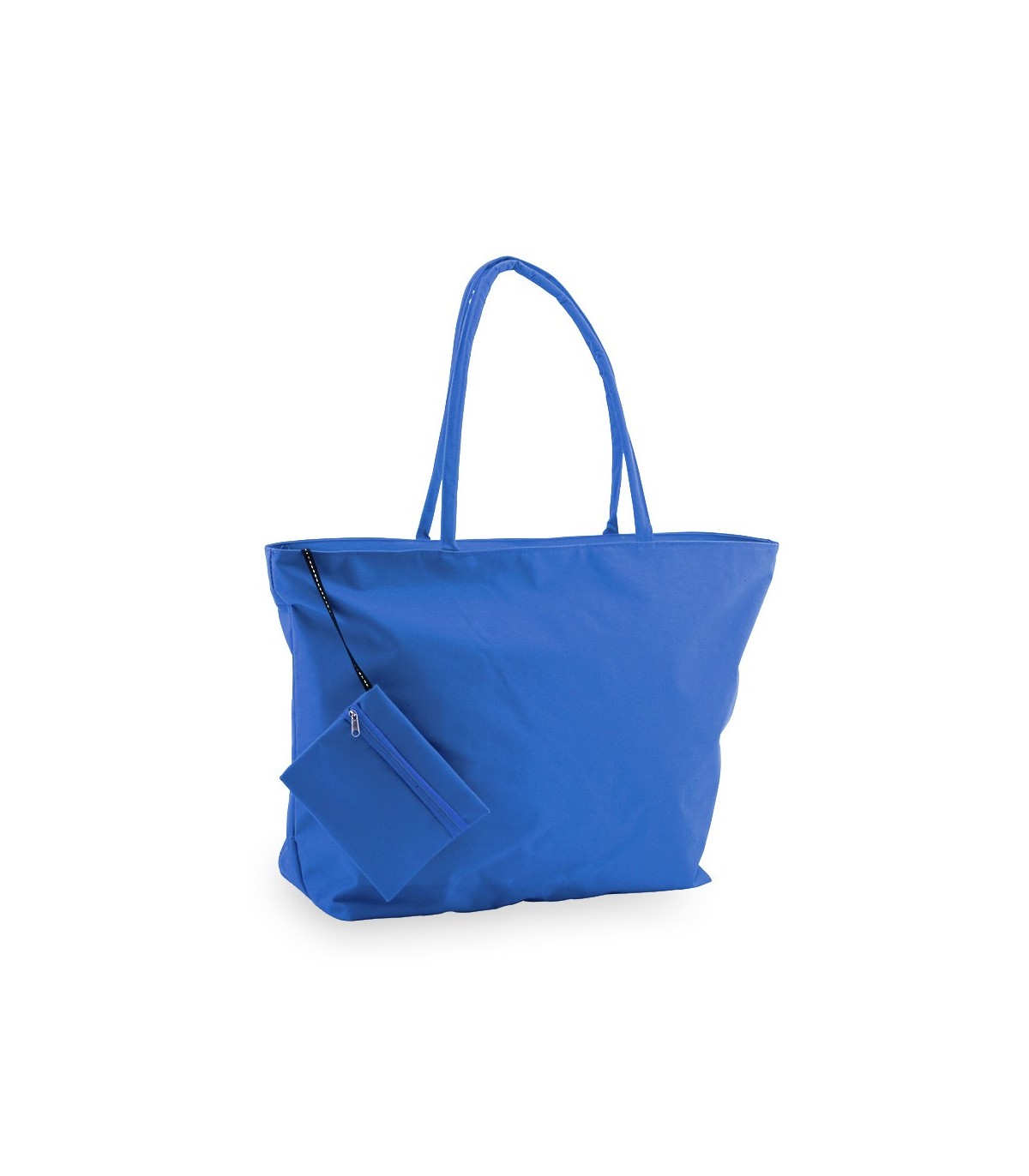 Original bolsa de playa en resistente poliéster 600D de vivos colores con neceser interior a juego. Con asas largas para hombro y cierre de cremallera.