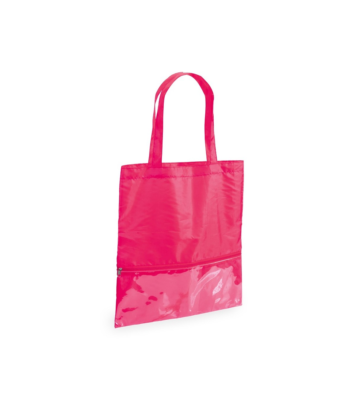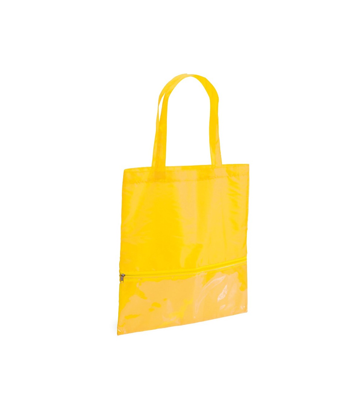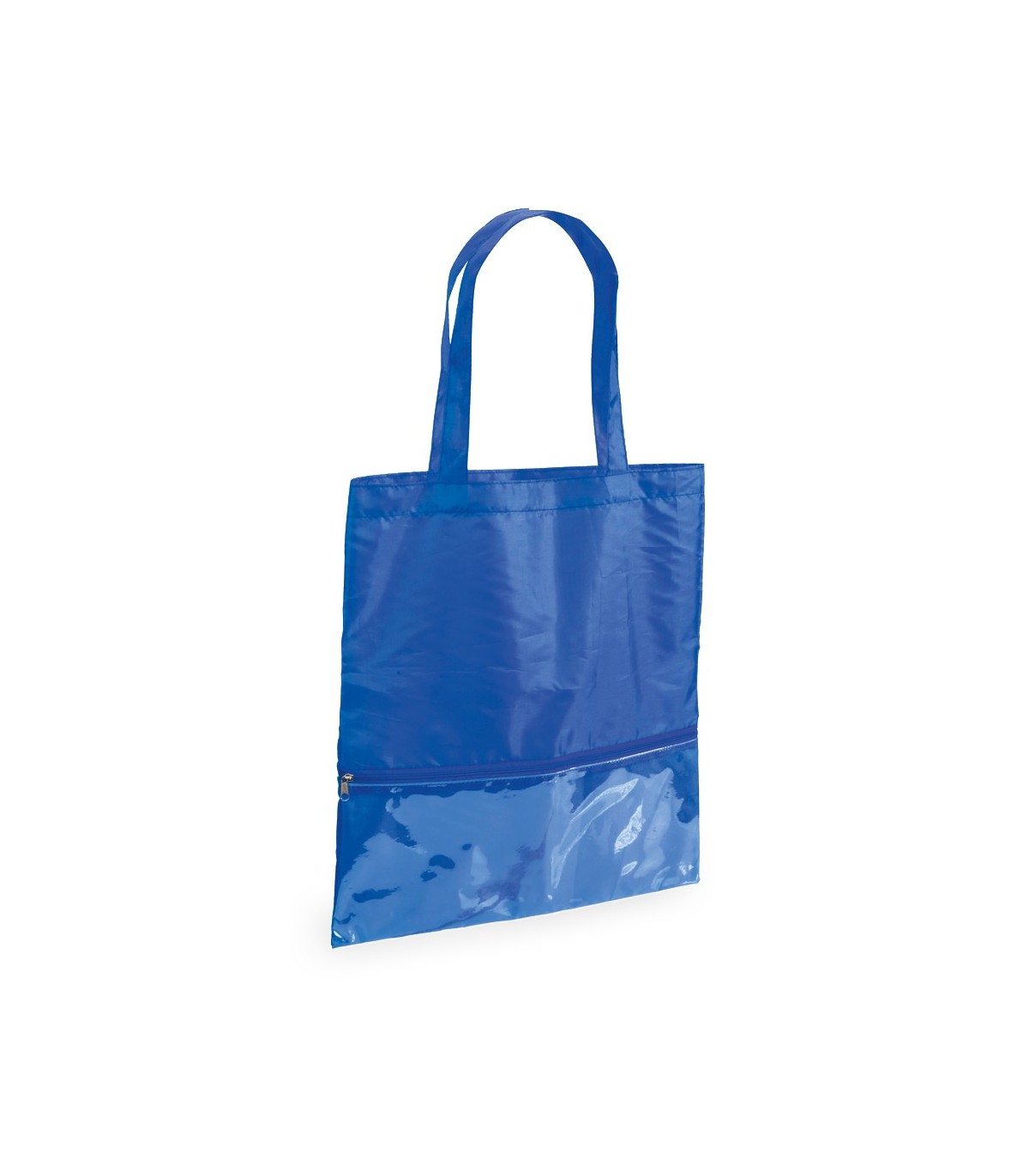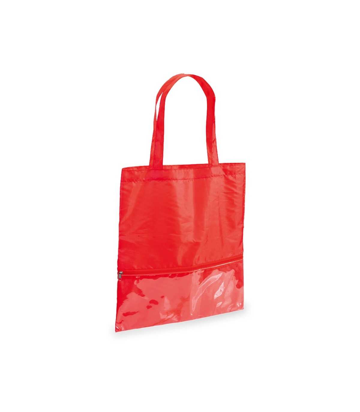 Original bolsa en combinación de suave poliéster 190T con PVC. Con asa mediana y bolsillo de PVC transparente. Acabado cosido.