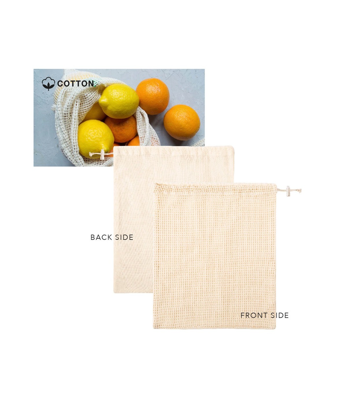 Bolsas de redecilla de línea ecológica en algodón crudo de 120g/m², con una cara lisa para impresión. Cierre de cordón con accesorio de ajuste.