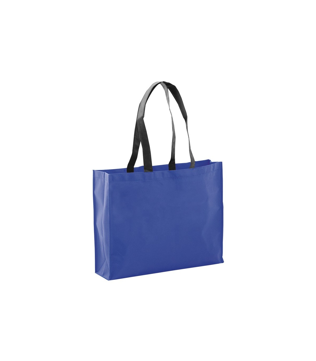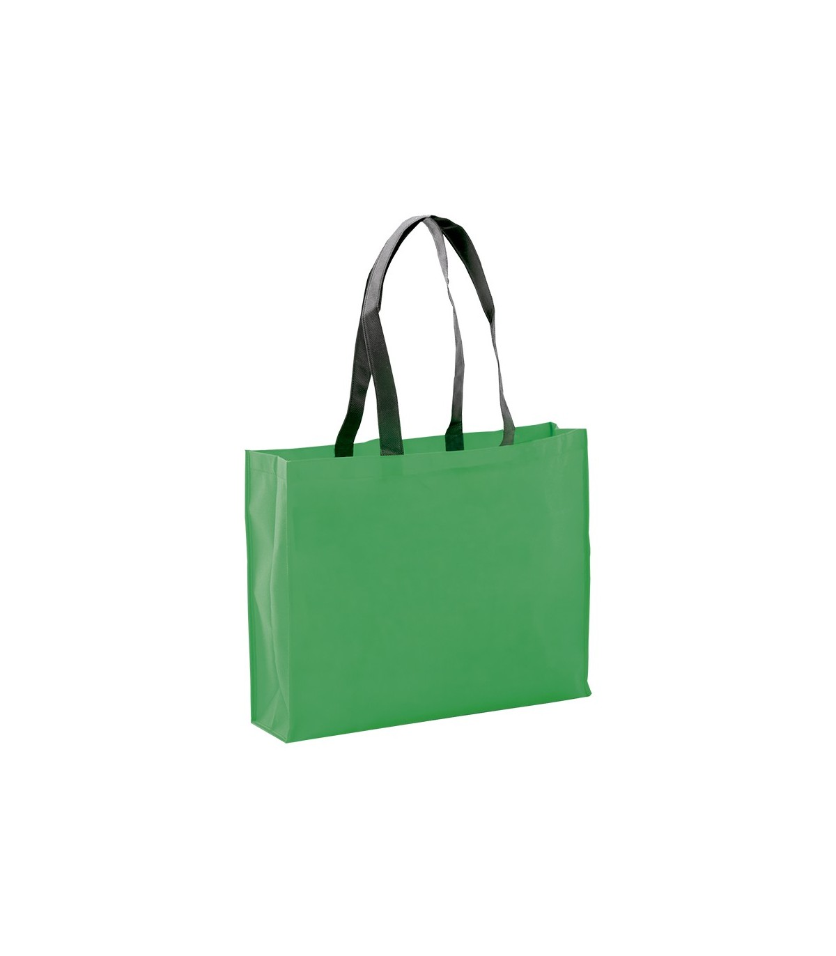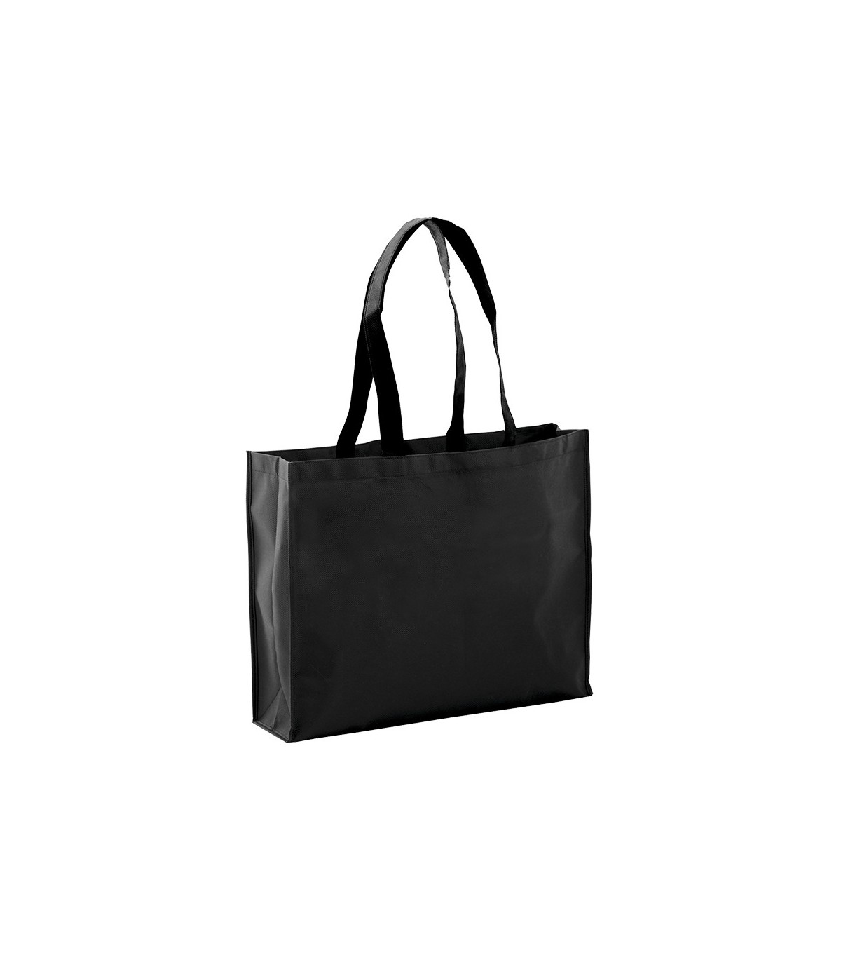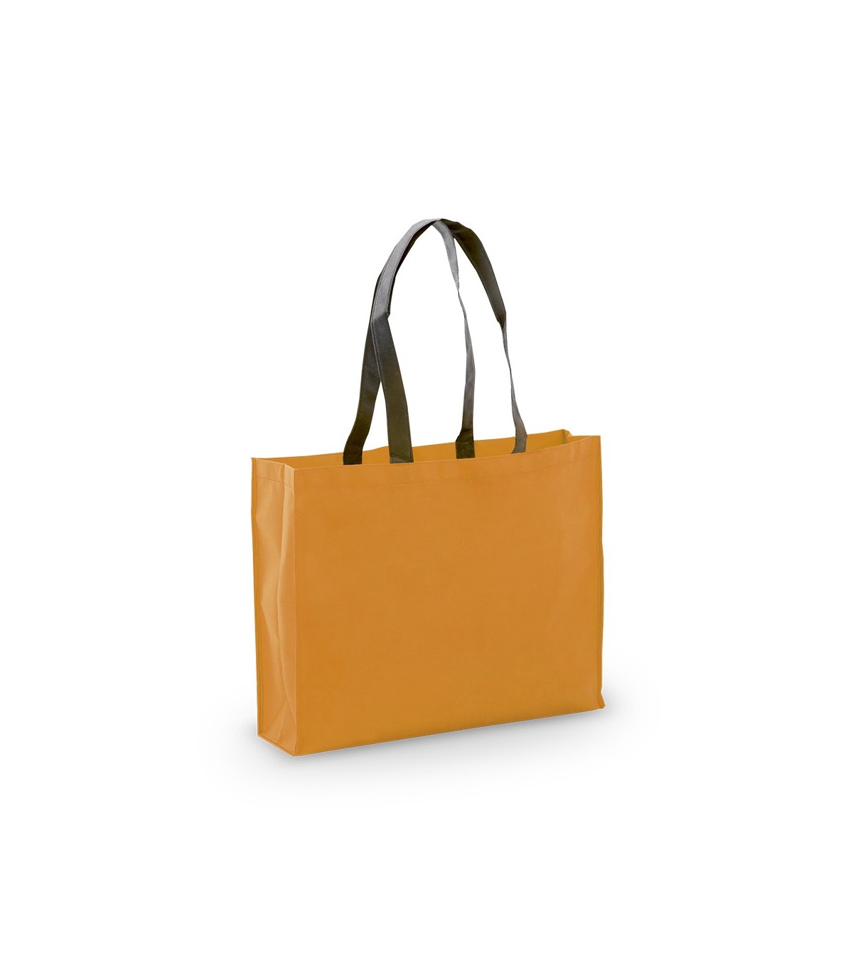 Bolsas en non-woven de 100g/m², en diferentes colores llamativos para personalizar. Con asas largas de 70cm en color negro, fuelle reforzado con ribete a juego y acabado cosido. Con capacidad de almacenaje de hasta 9kg de peso.