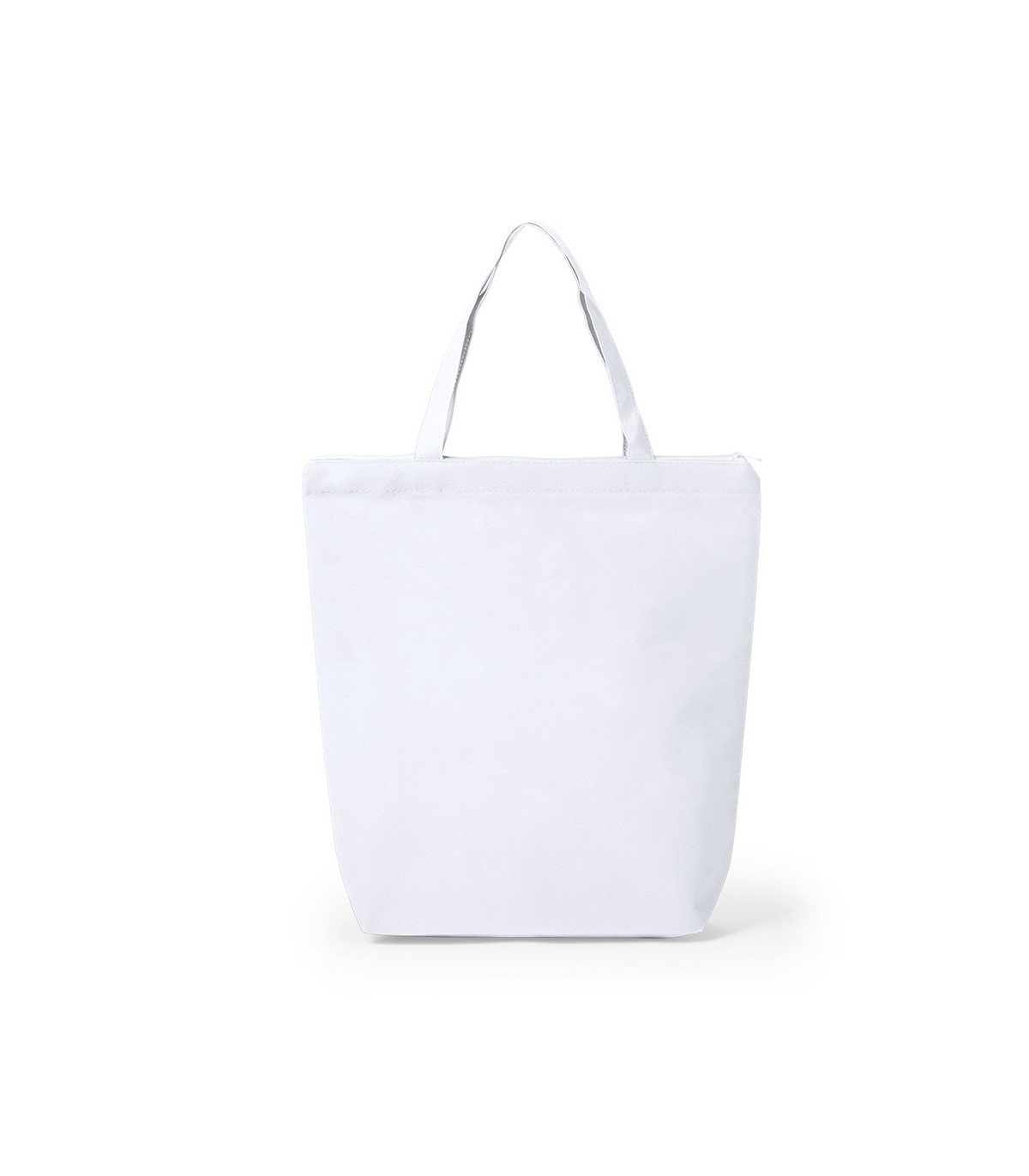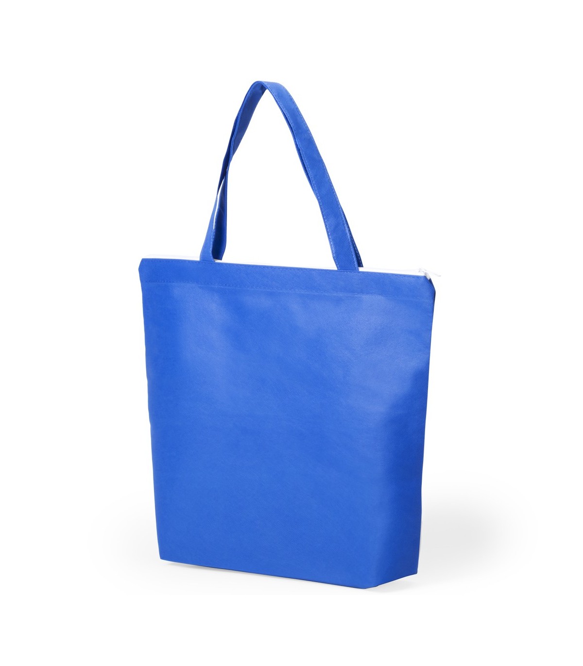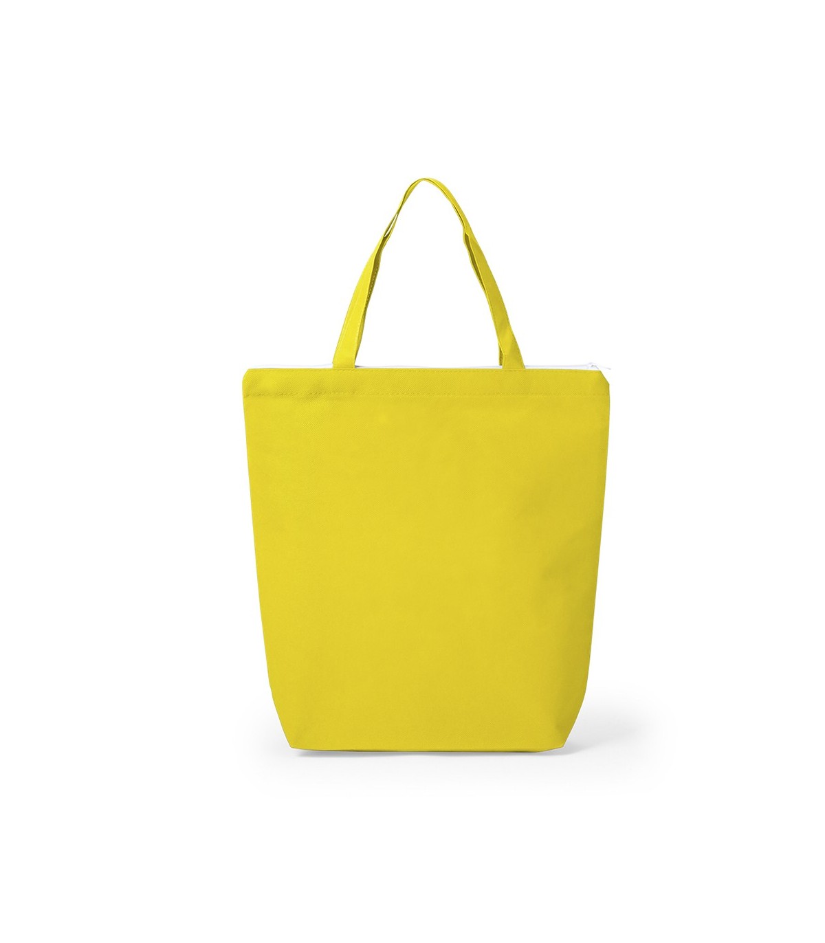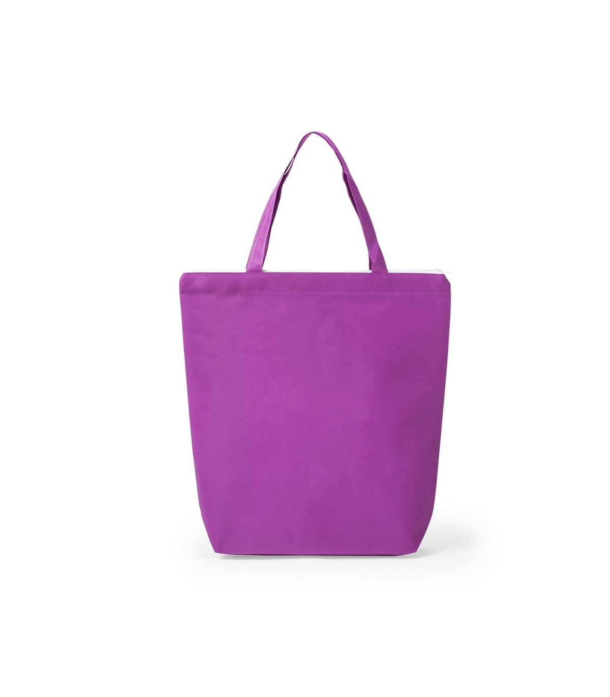Bolsas de non-woven de 90 g/m² en diferentes colores llamativos para personalizar. Con cierre de cremallera en color blanco, fuelle, asas medianas de 45cm y acabado cosido. Con capacidad de almacenaje de hasta 6kg de peso.