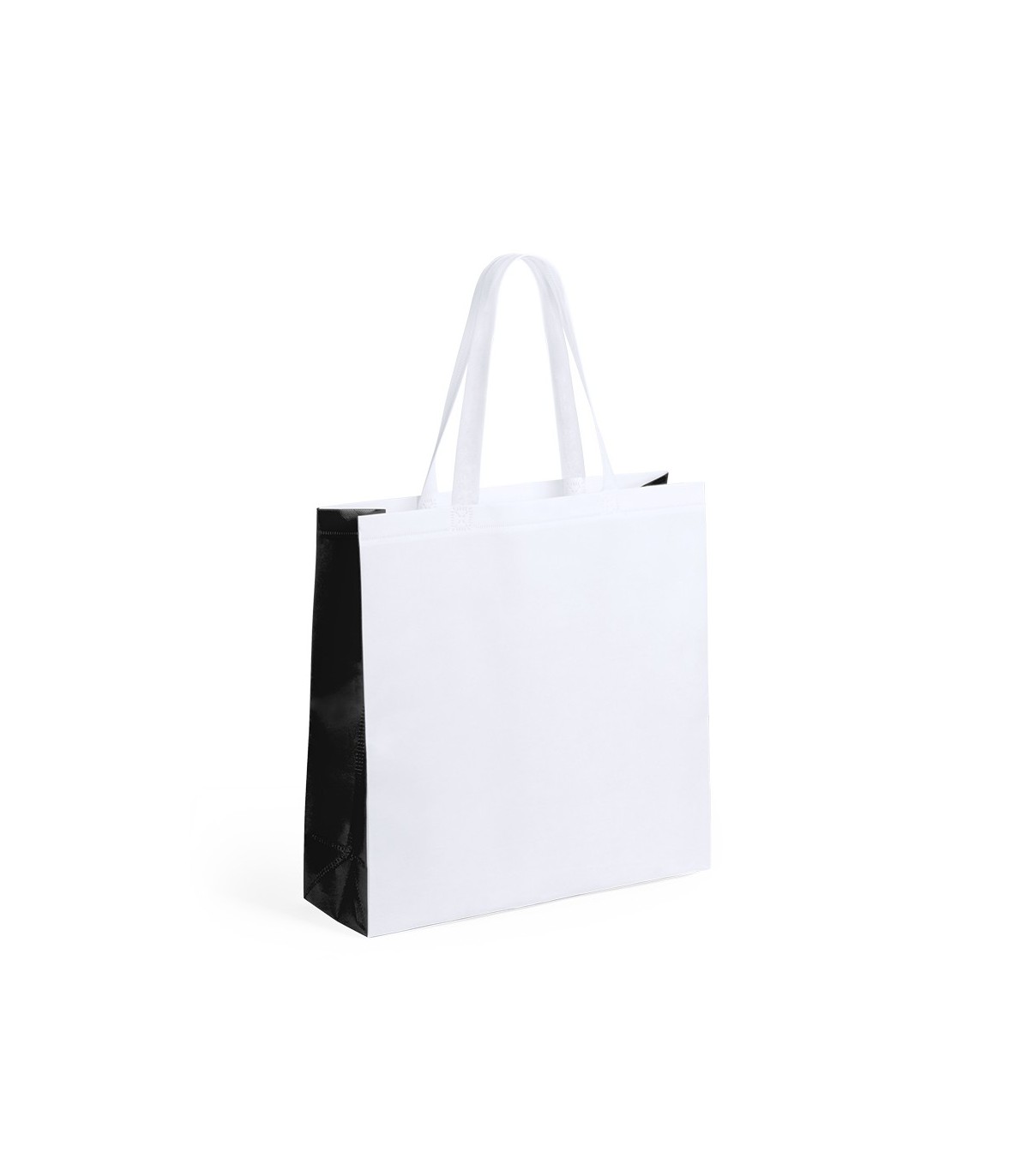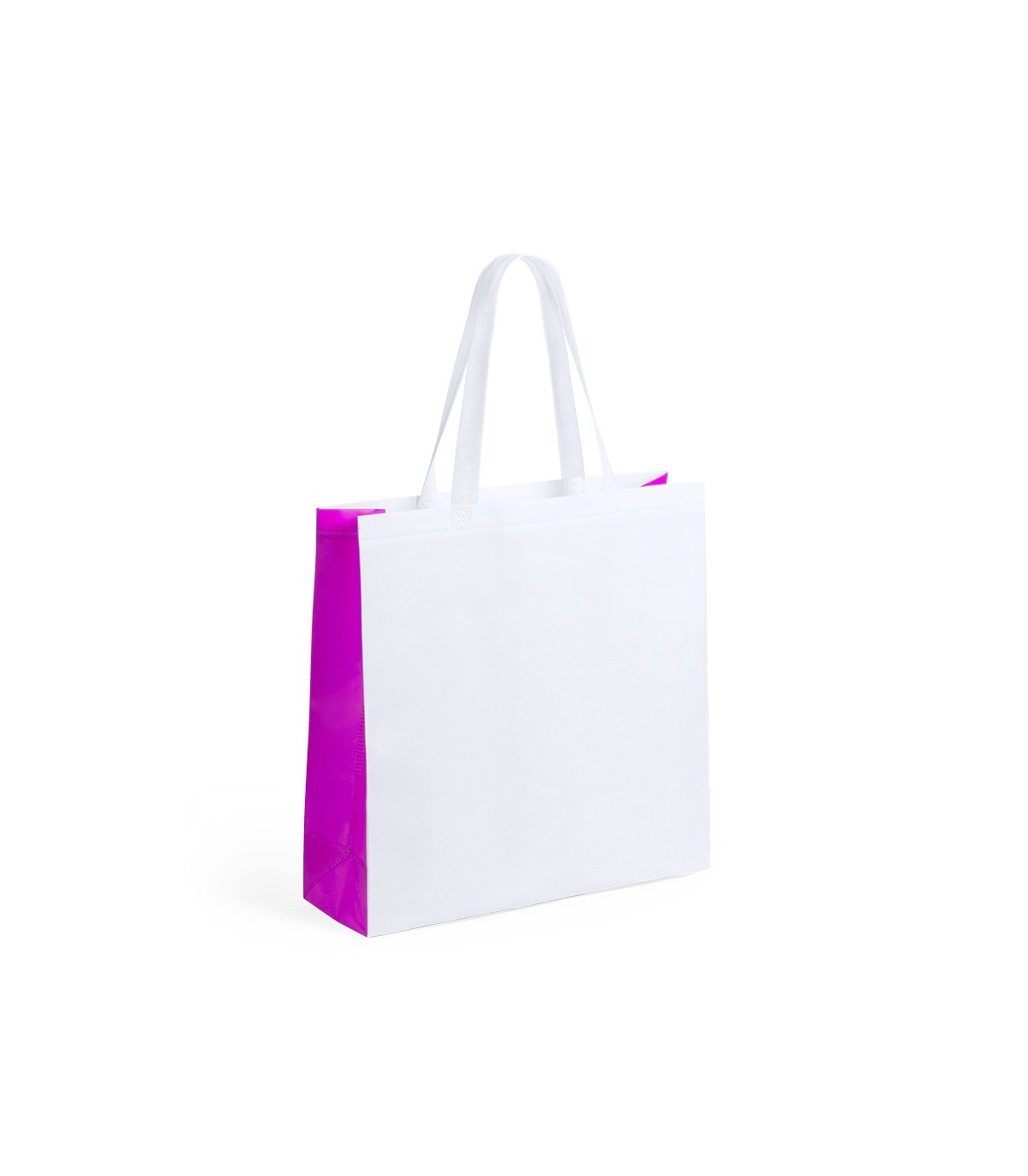 Bolsas en non-woven laminado de 110g/m², en combinación de cuerpo y asas en color blanco y fuelles en diferentes colores llamativos para personalizar brillantes. Con asas reforzadas medianas de 54cm, fuelle y acabado termosellado. Con capacidad de almacenaje de hasta 9kg de peso.