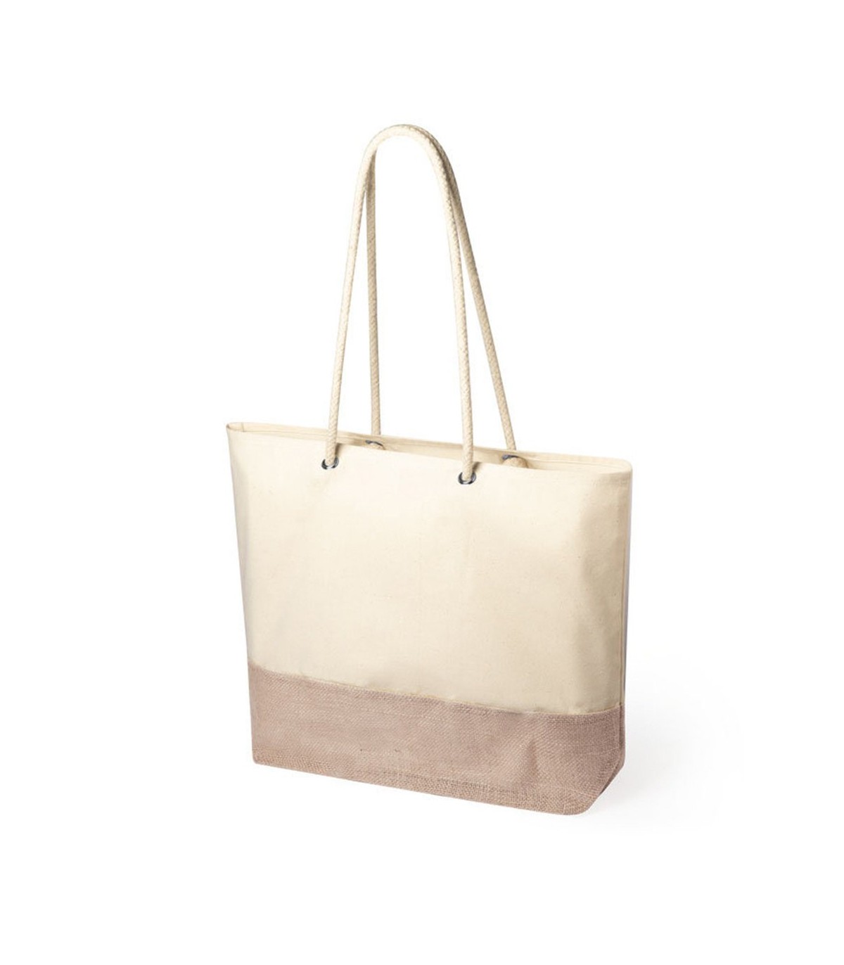 Bolsas de fabricación ecológica, en combinación de materiales yute y algodón. Tamaño 48 x 35 + 15 cm, de acabado cosido y con asas largas reforzadas de 90 cm en algodón. Con capacidad de almacenaje hasta 9 kg de peso.
