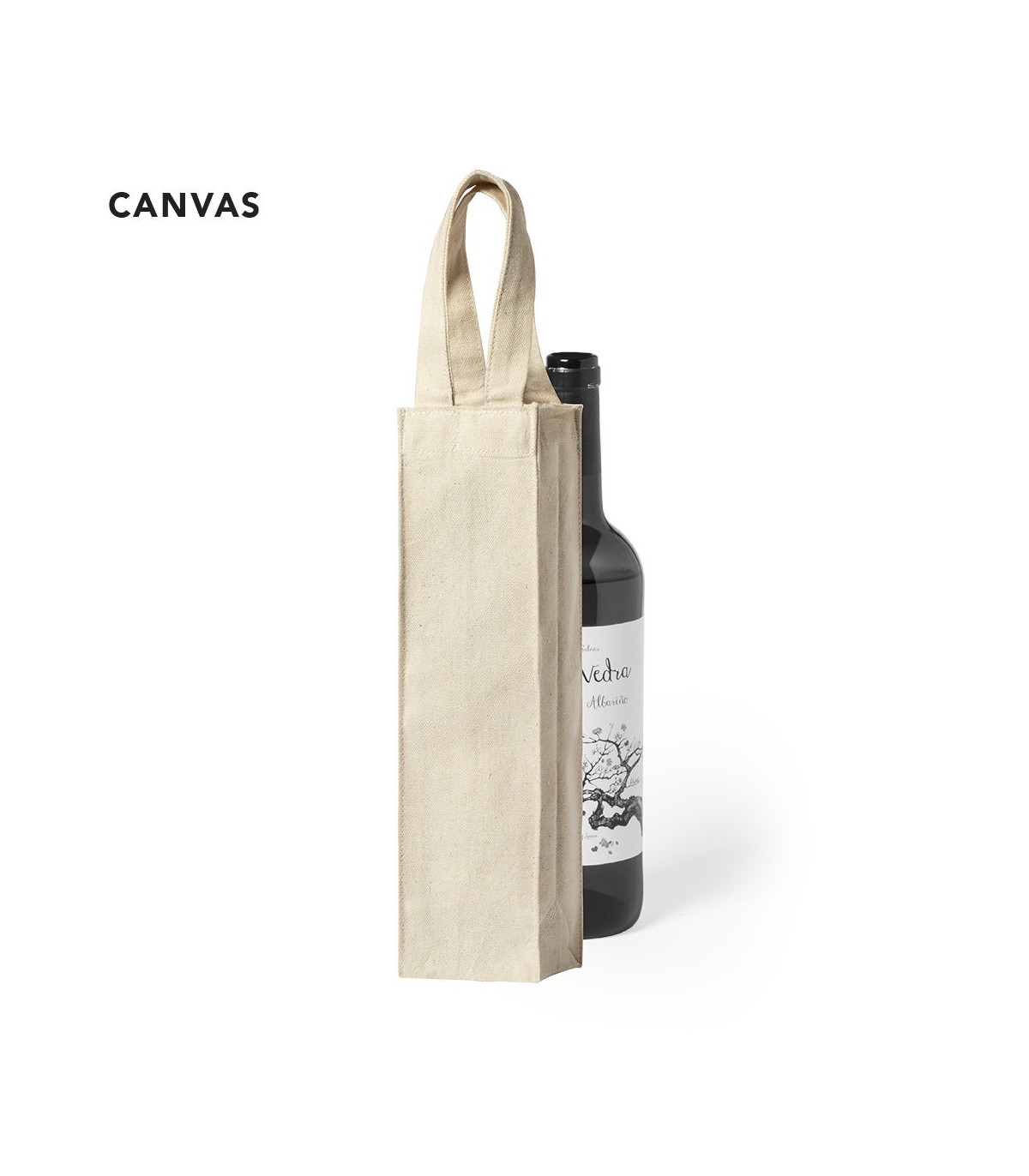 Bolsas de canvas de 220 g/m² para botella de vino de 75cl. En color natural, con resistente acabado cosido y asas reforzadas.