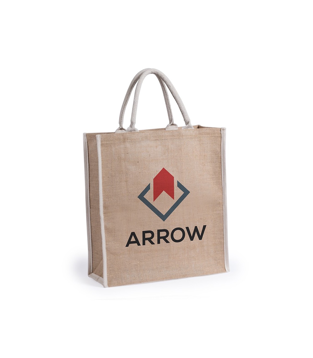 Bolsas de yute con asas blanca y delicado detalle del mismo colores de las asas alrededor de la bolsa, con fuelles y personalizadas en serigrafia.