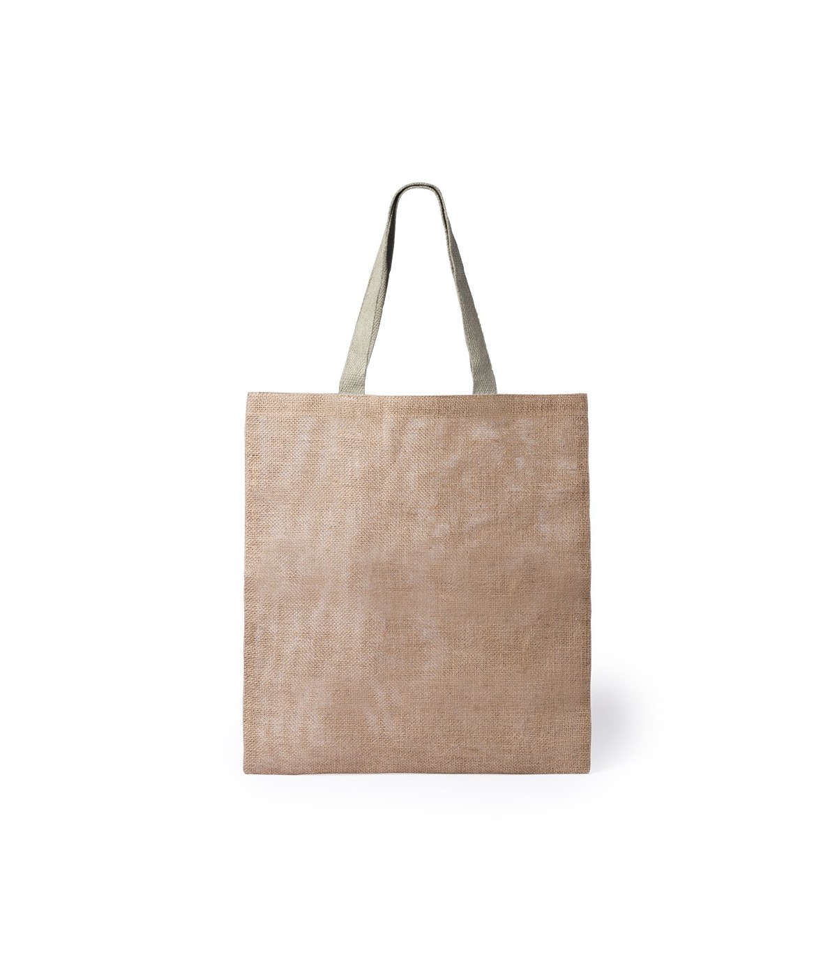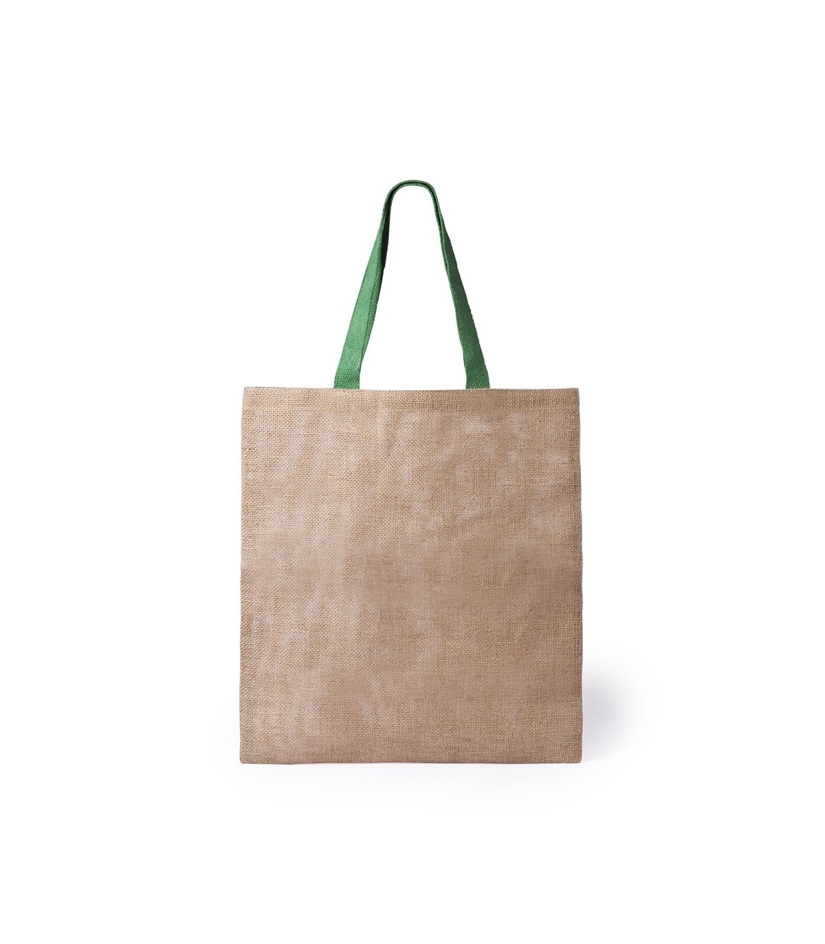Bolsas ecológica de yute con cuerpo en color natural y asas medianas de 52cm en color verde. De acabado cosido y Con capacidad de almacenaje de hasta 9kg de peso.